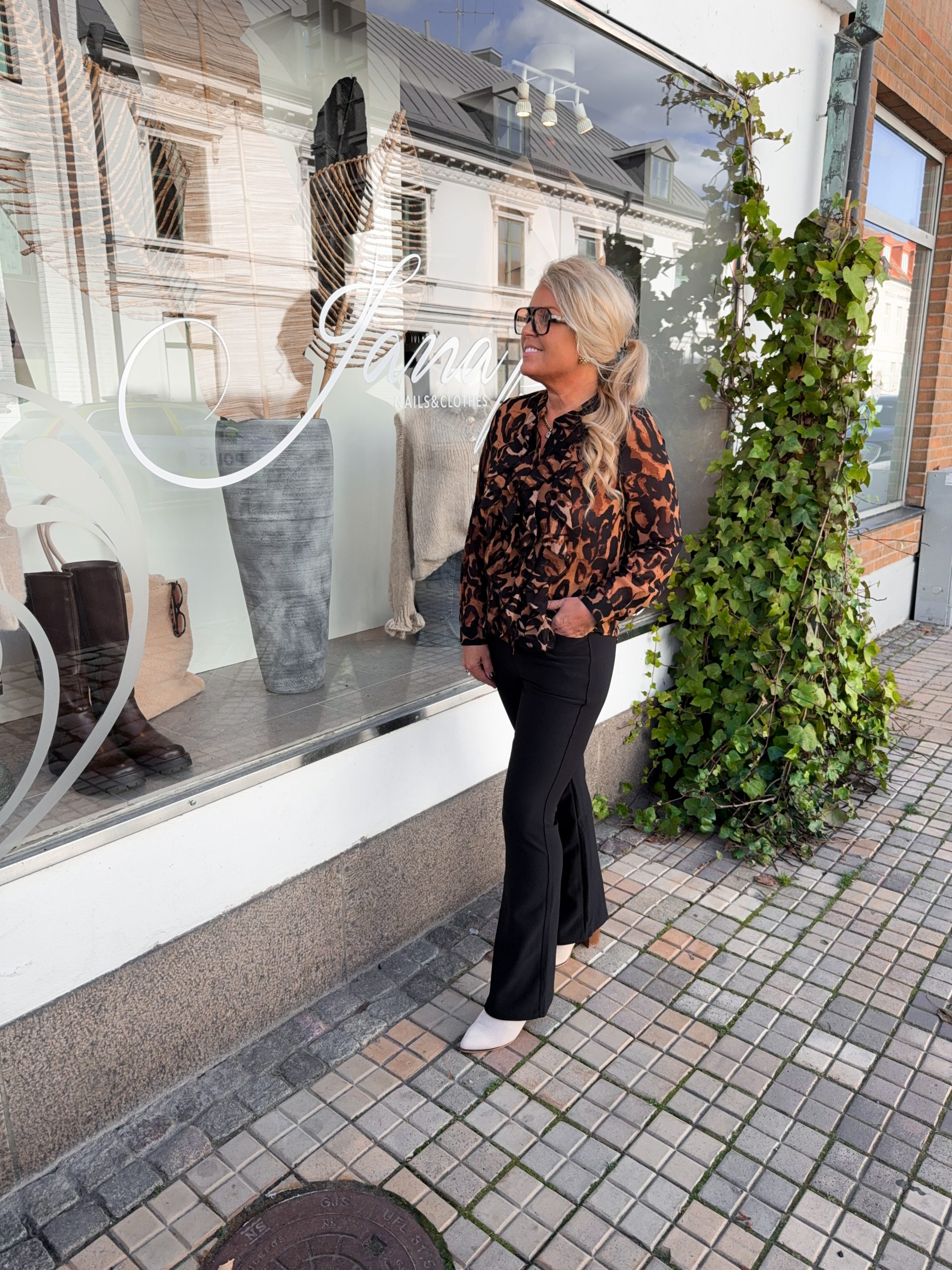 En magiskt skön och stretchig kostymbyxa med hög midja, fickor och guldspänne. Modellen är 167cm lång och bär M/L.