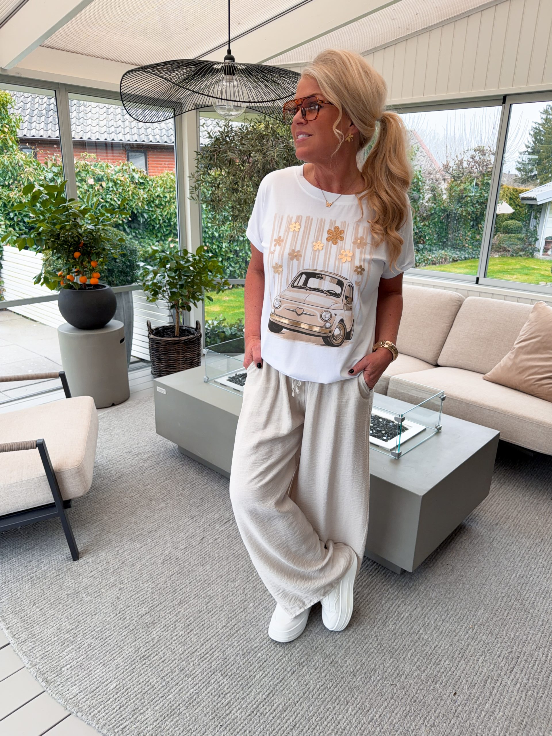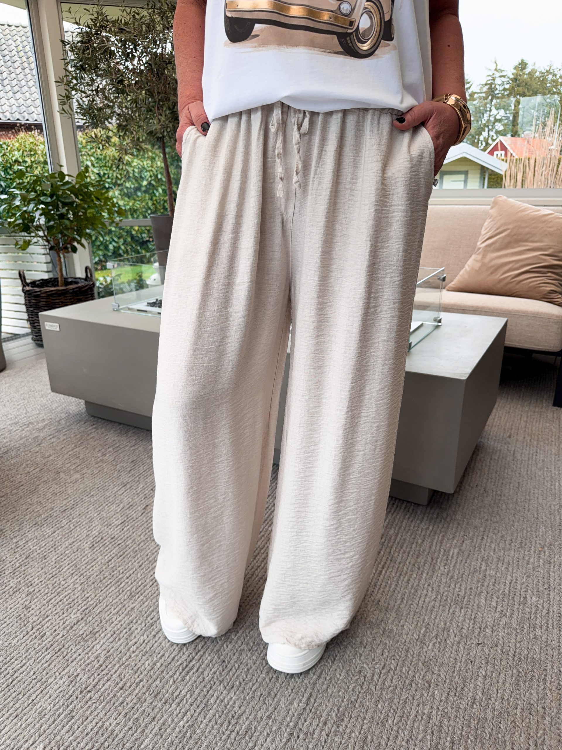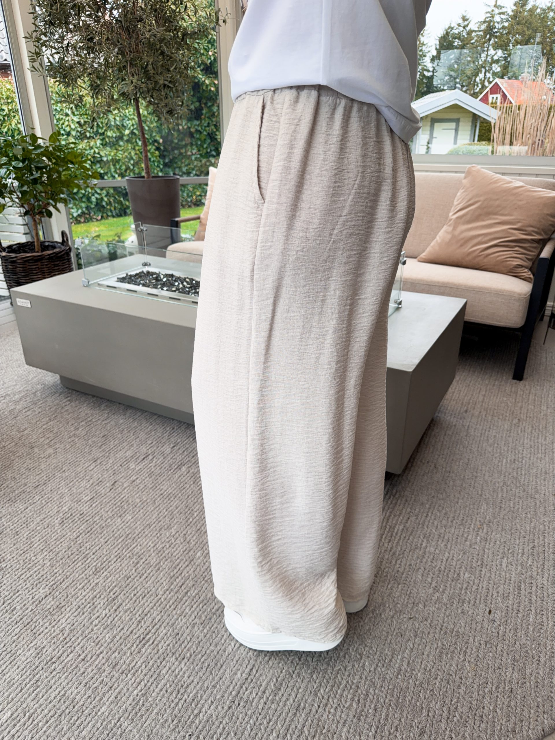 En otroligt skön och härlig viskosbyxa med vida ben. Resår och knyte i midjan. Jana är 167cm lång.