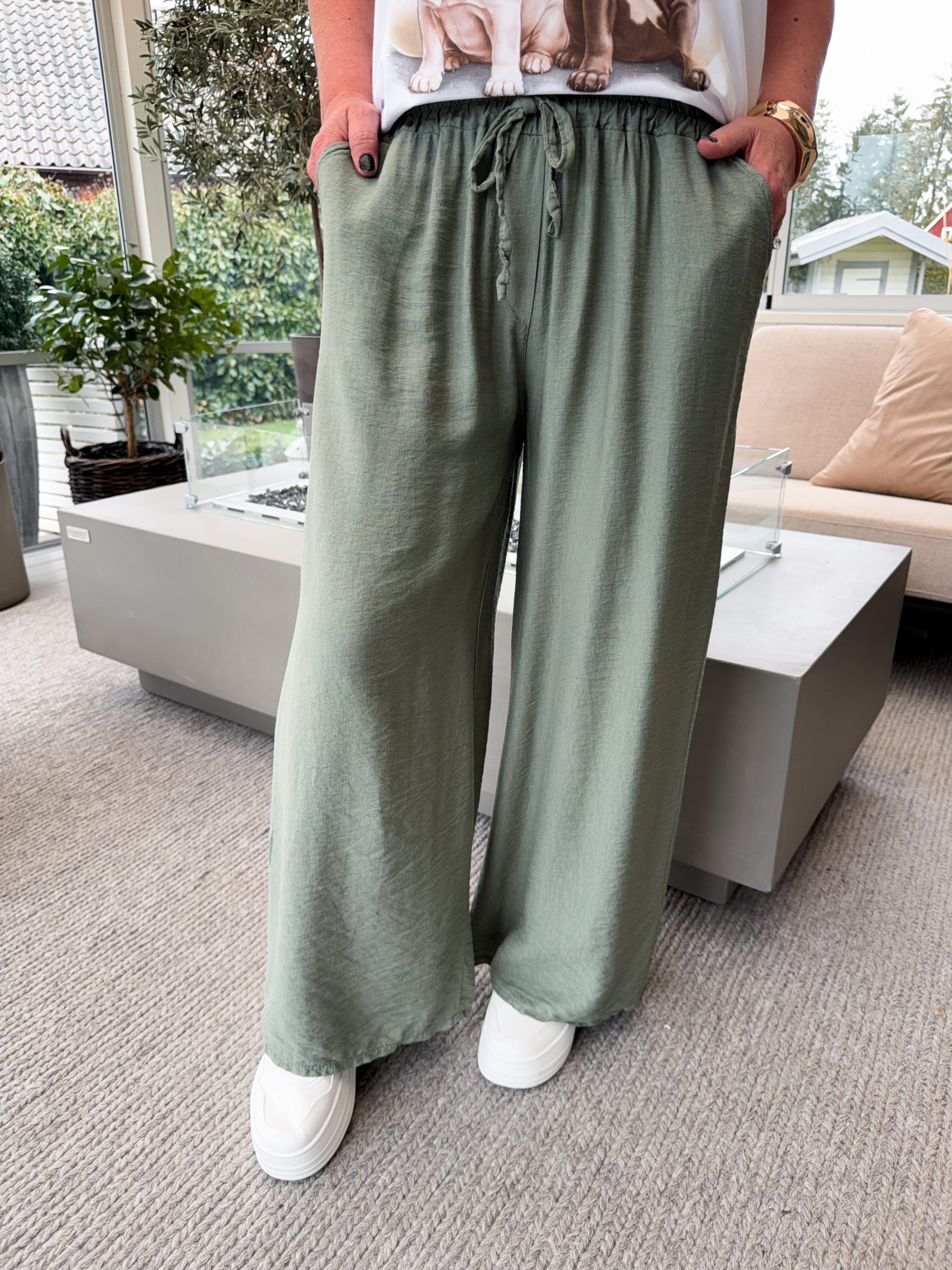 En otroligt skön och härlig viskosbyxa med vida ben. Resår och knyte i midjan. Jana är 167cm lång.