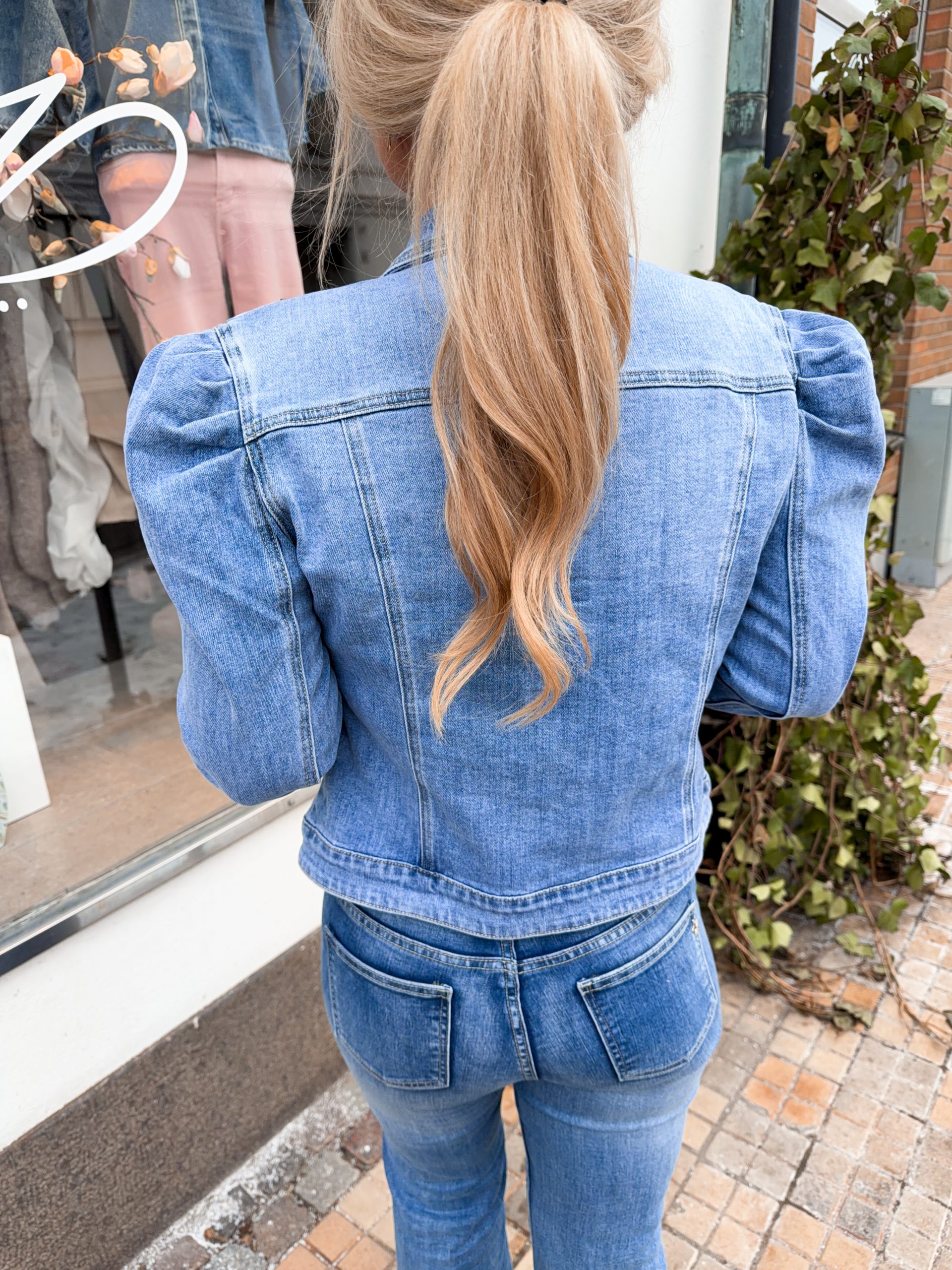 En häftig jeansjacka med guldknappar och puffärm. Modellen är 167cm lång och bär storlek 38/M.