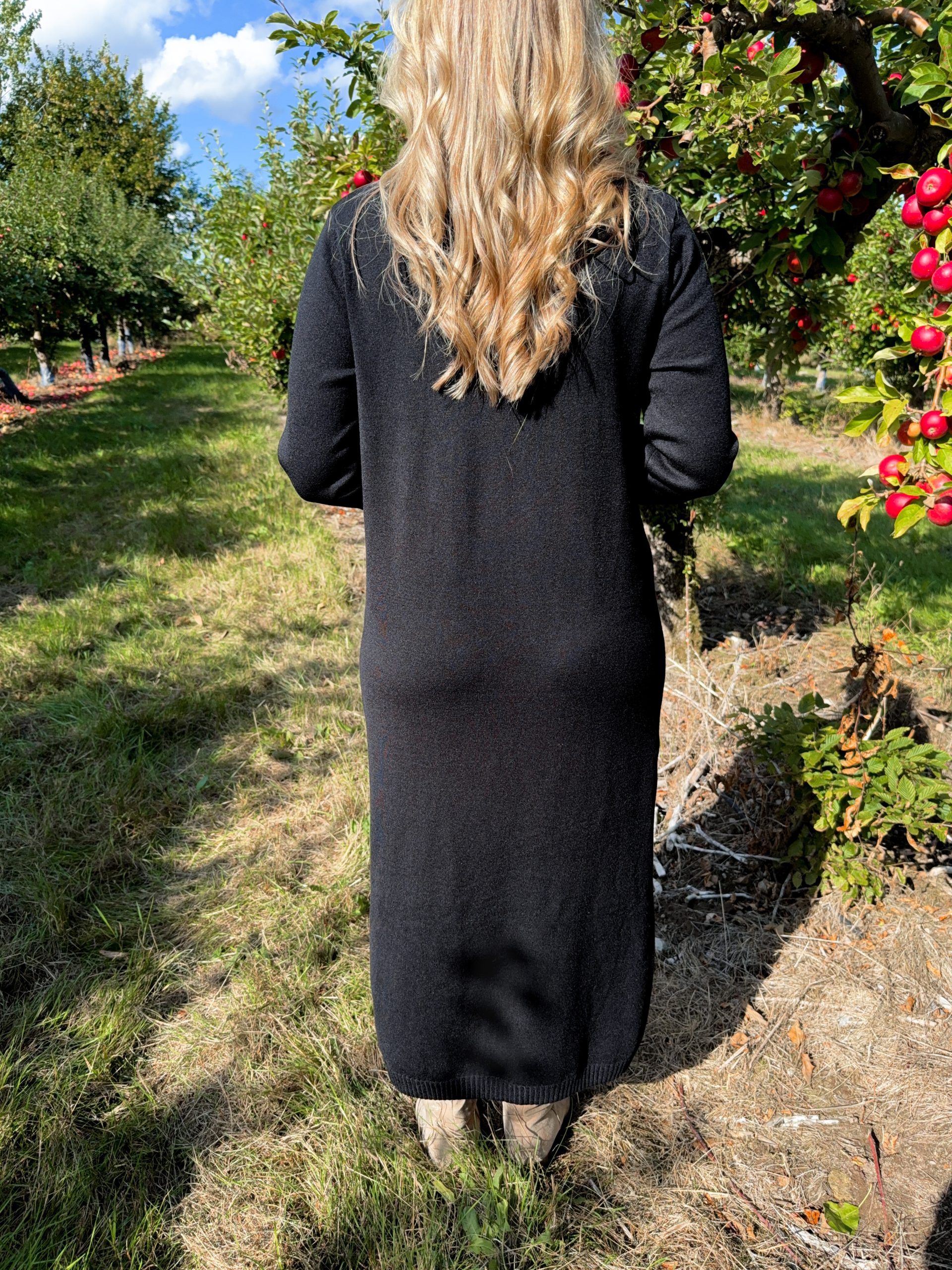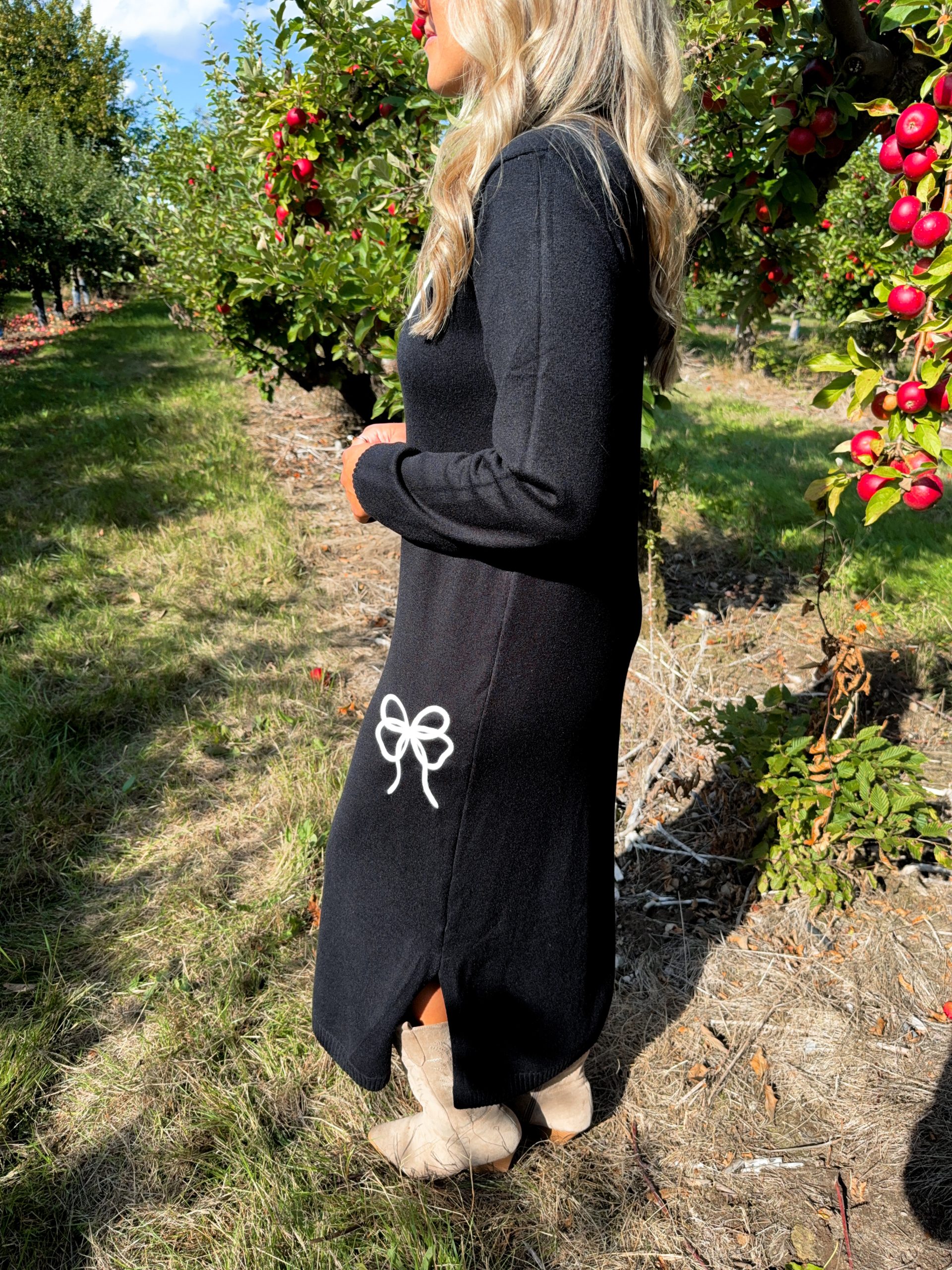 En galet skön och mjuk finstickad poloklänning med rosetter och slits på sidan. Modellen är 163cm lång och bär storlek S/M.