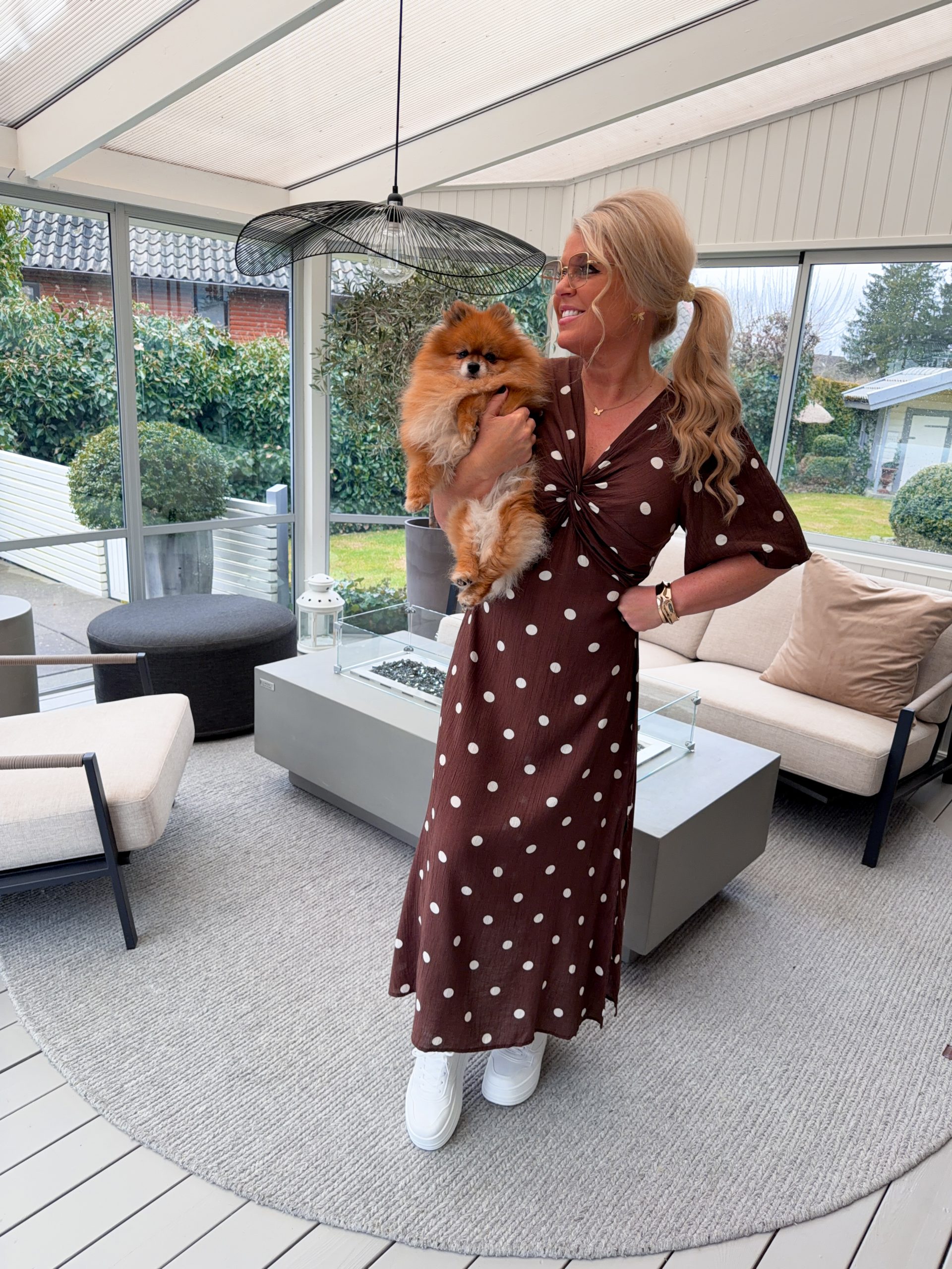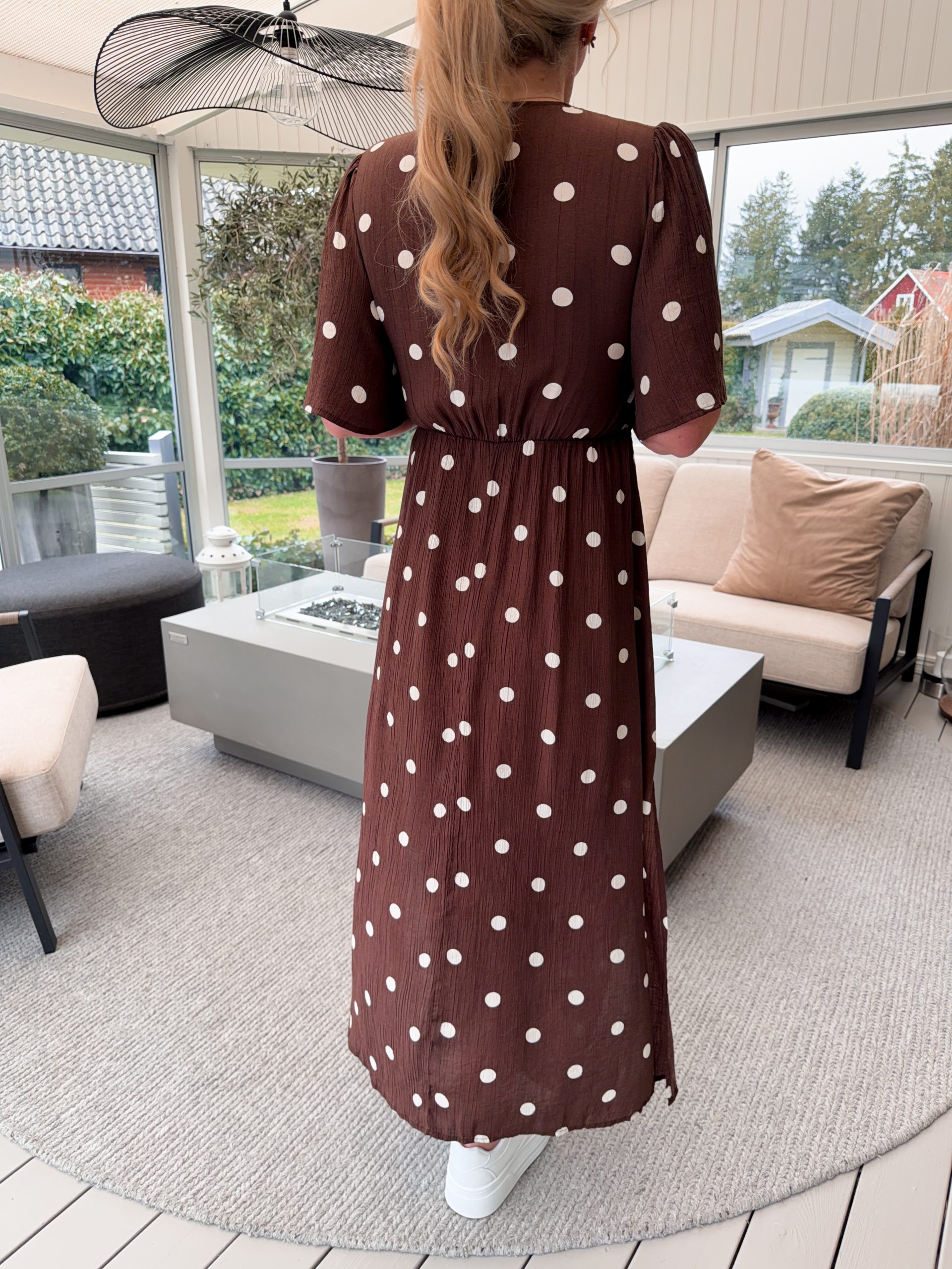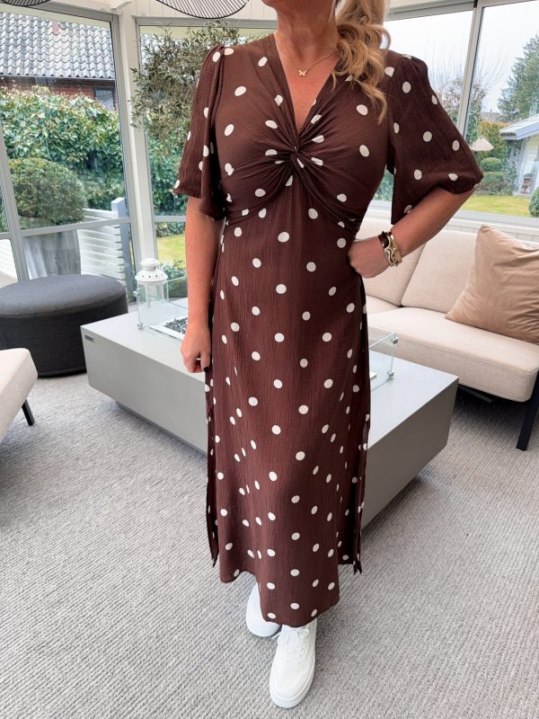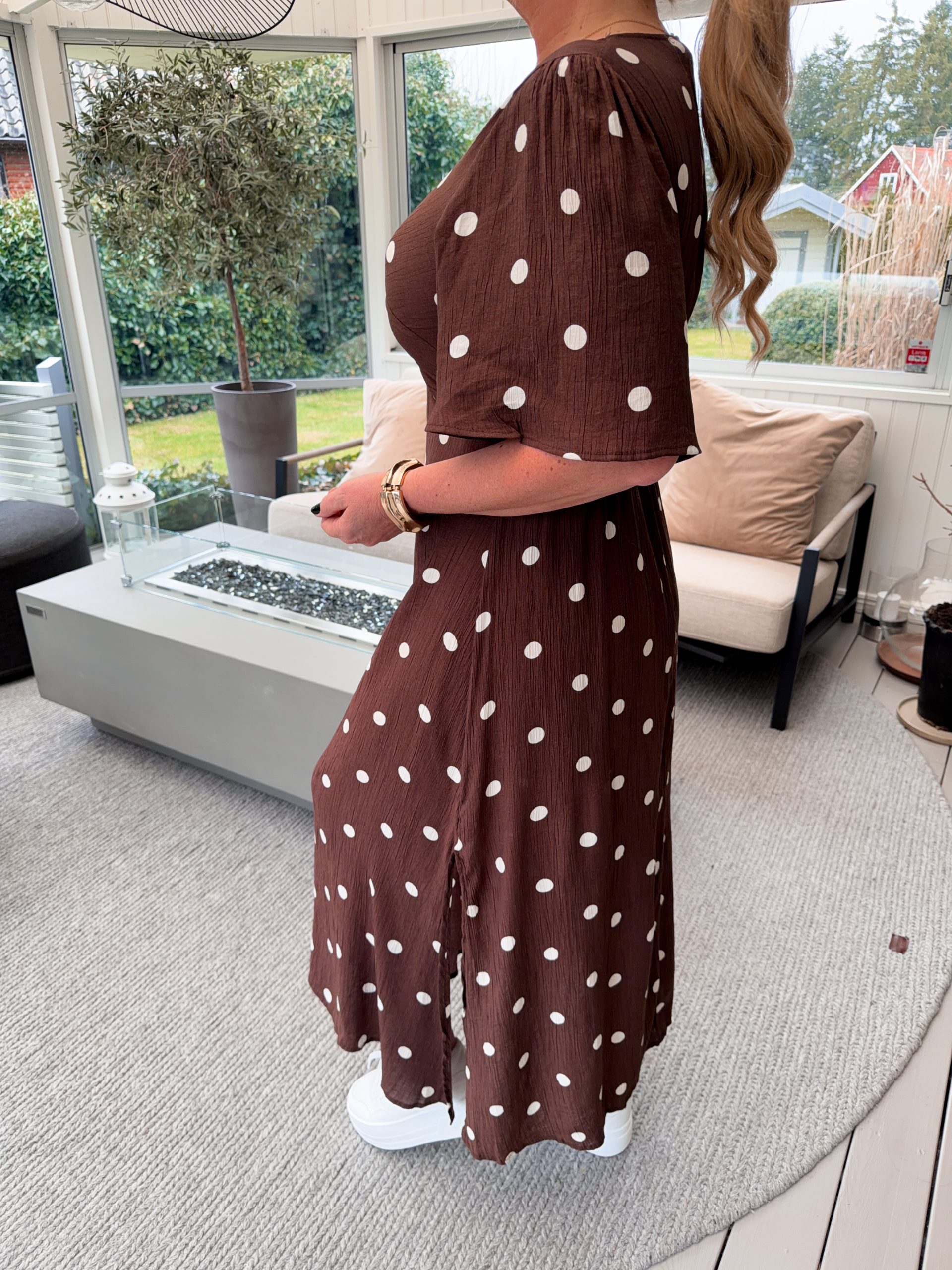 En superfin prickig klänning med knytdetalj vid bysten. Kräppat tyg och slits på sidorna. Jana bär S/M.