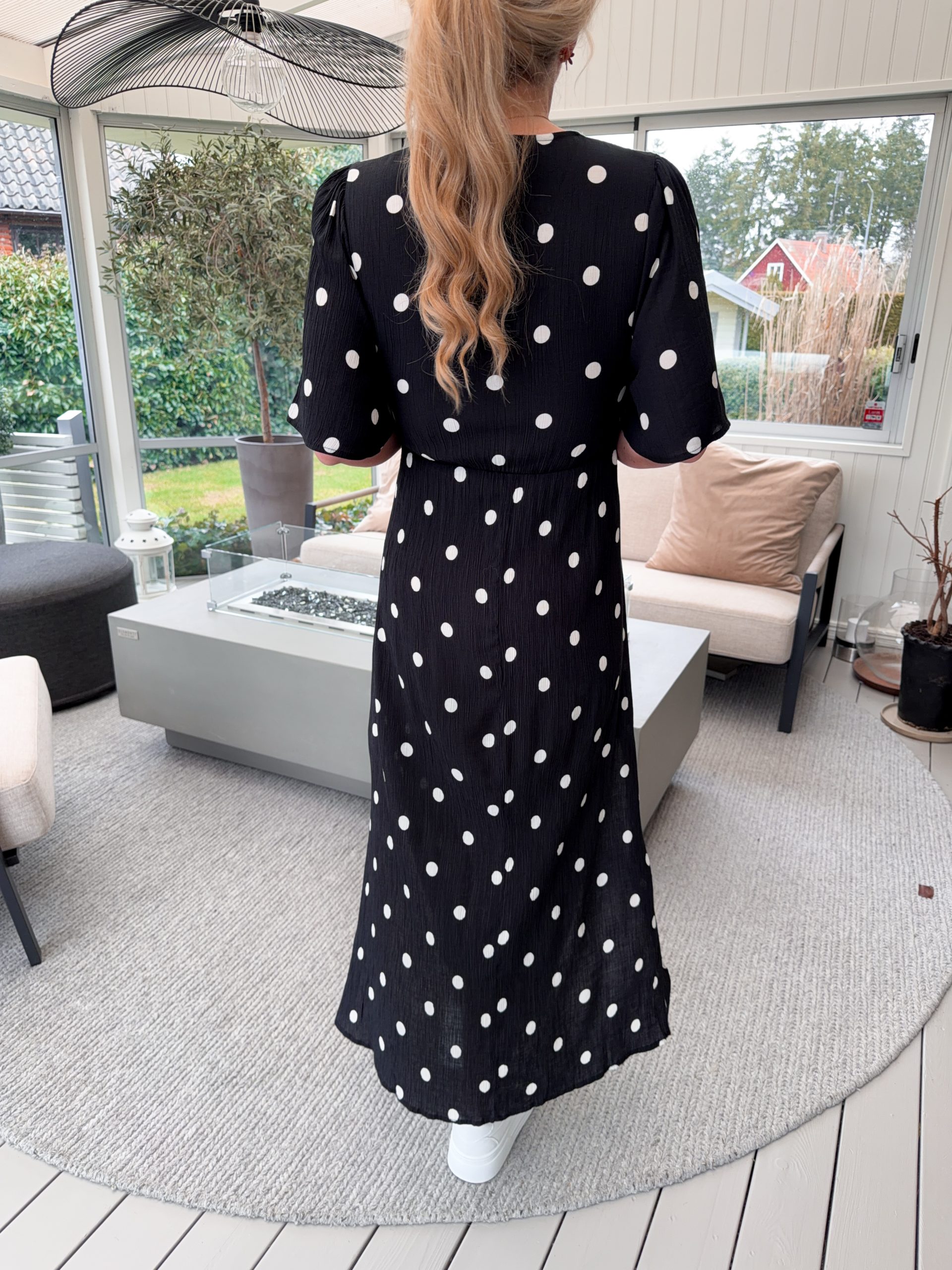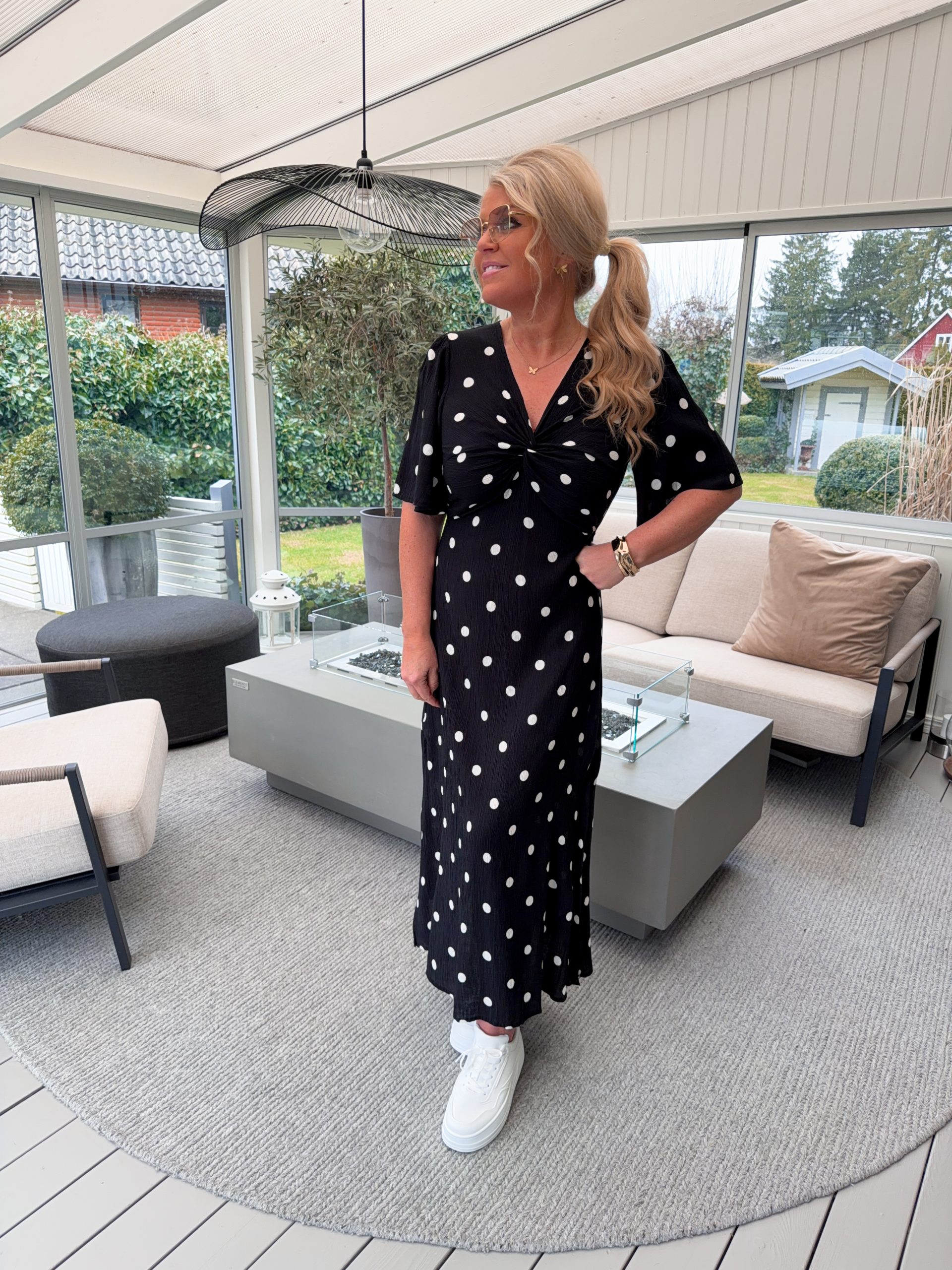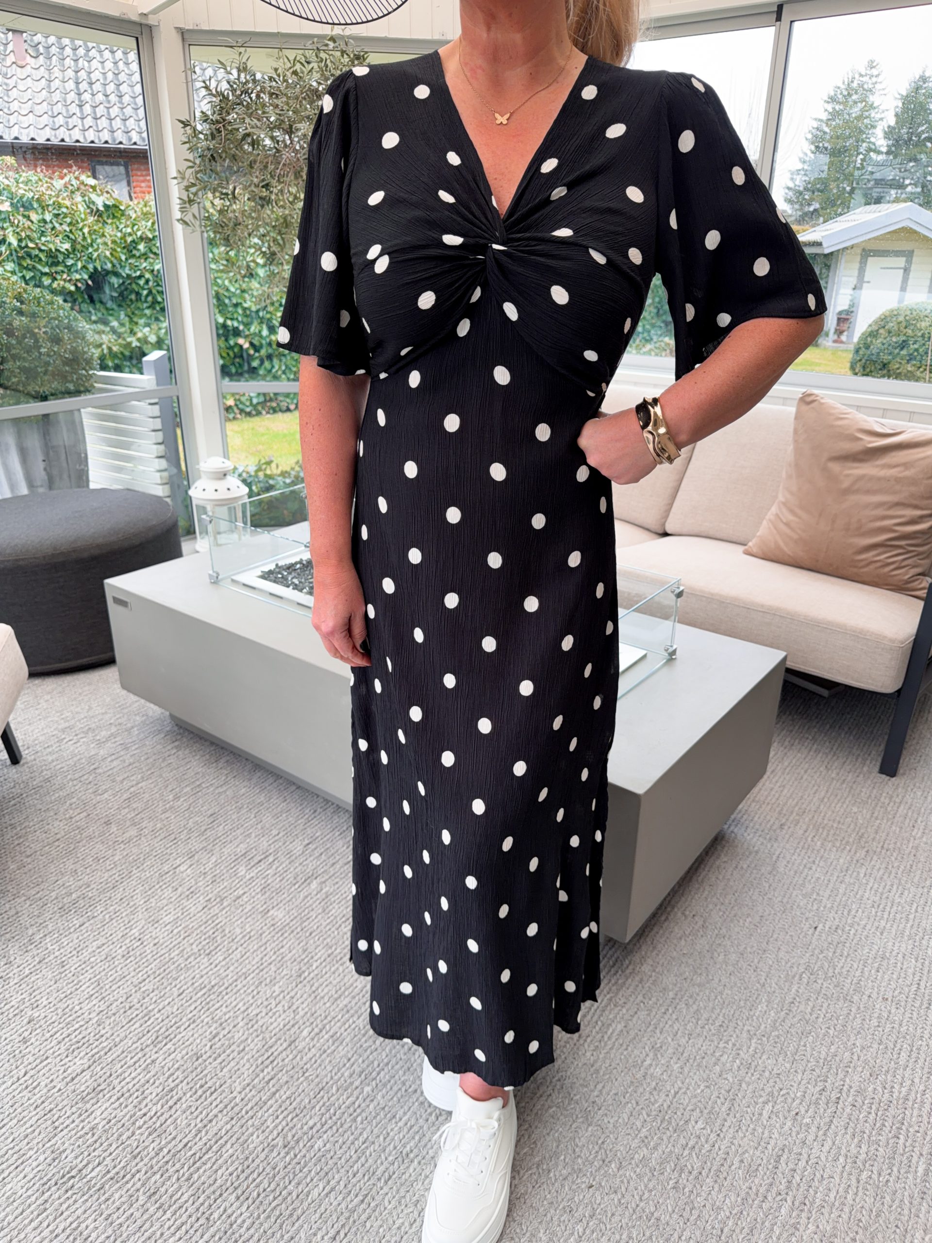 En superfin prickig klänning med knytdetalj vid bysten. Kräppat tyg och slits på sidorna. Jana bär S/M.