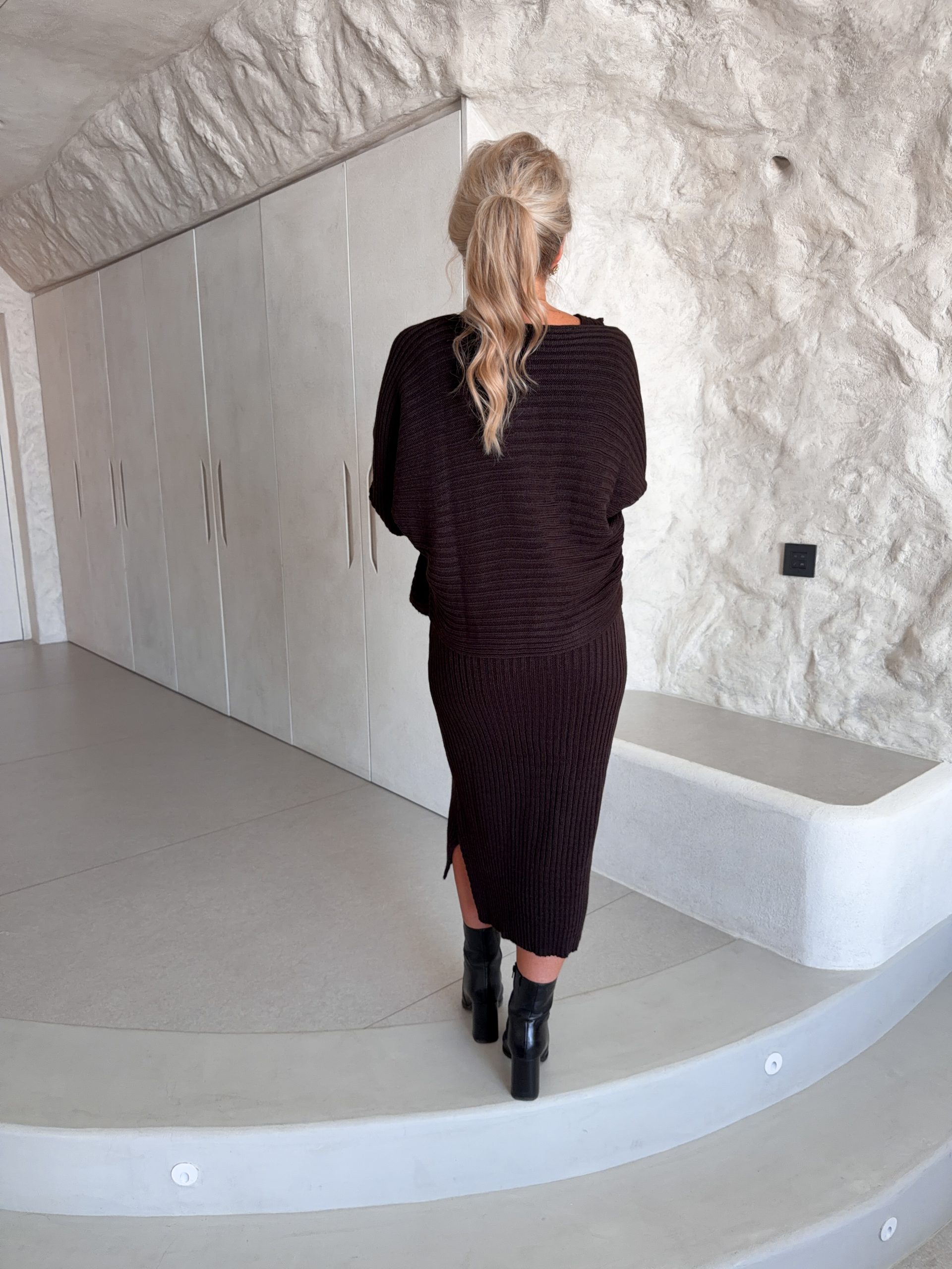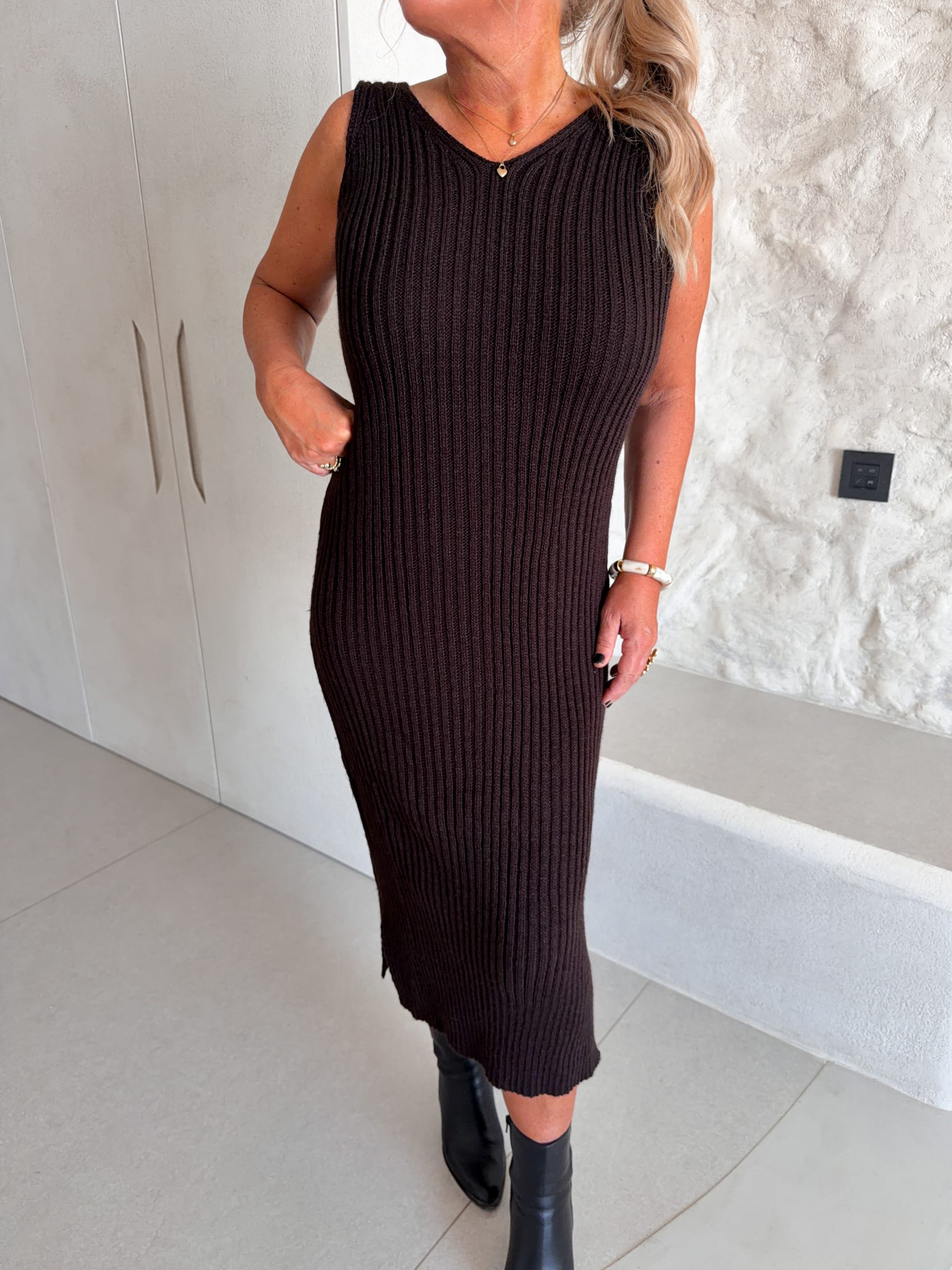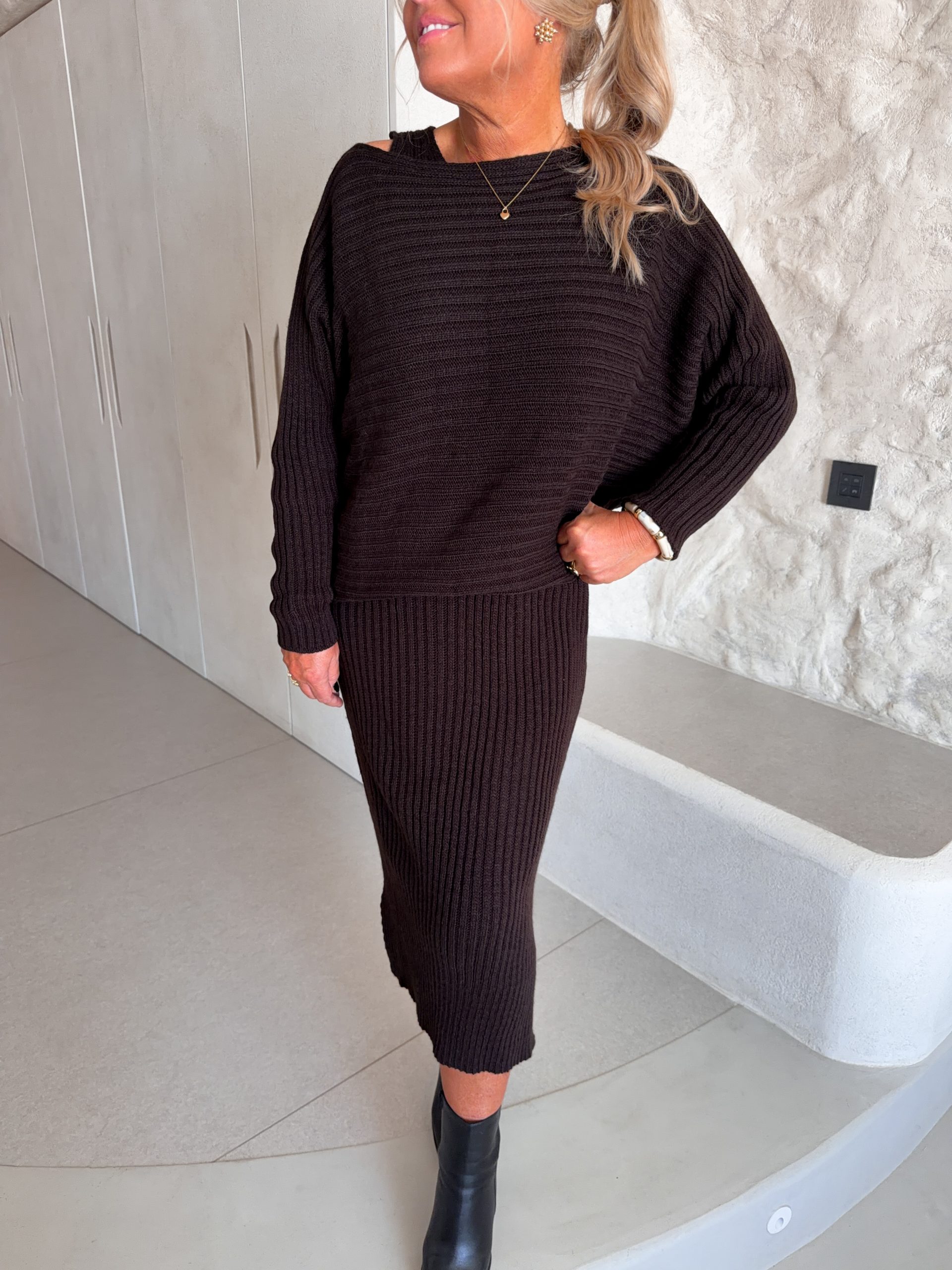 Ett ribbstickat set med klänning och tröja från Marta Du Chateau. Modellen är 167cm lång och bär S/M.
