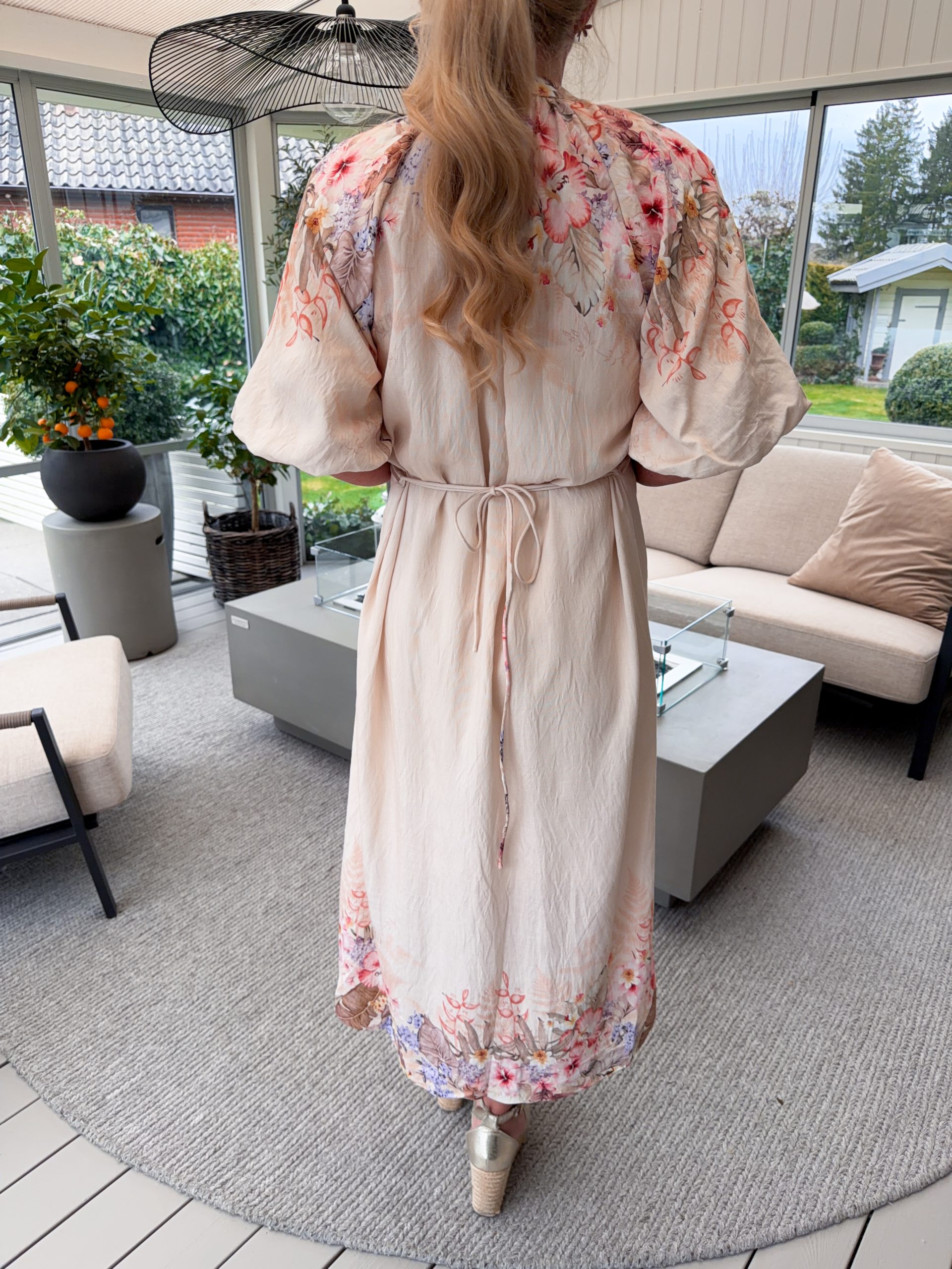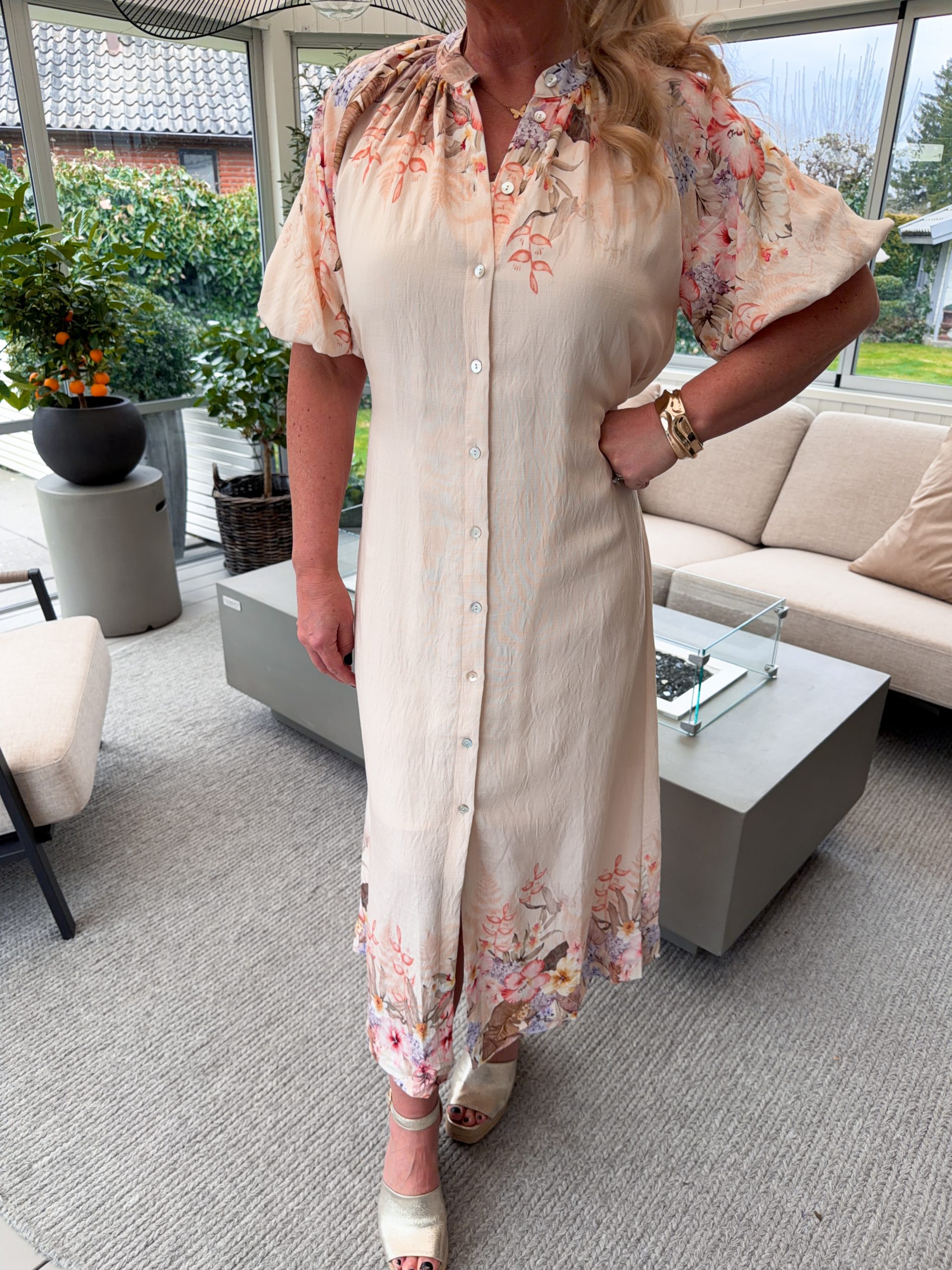 En supersnygg skjortklänning med puffärm och knyte i midjan. Underklänning ingår. Modellen är 167cm lång och bär storlek S.