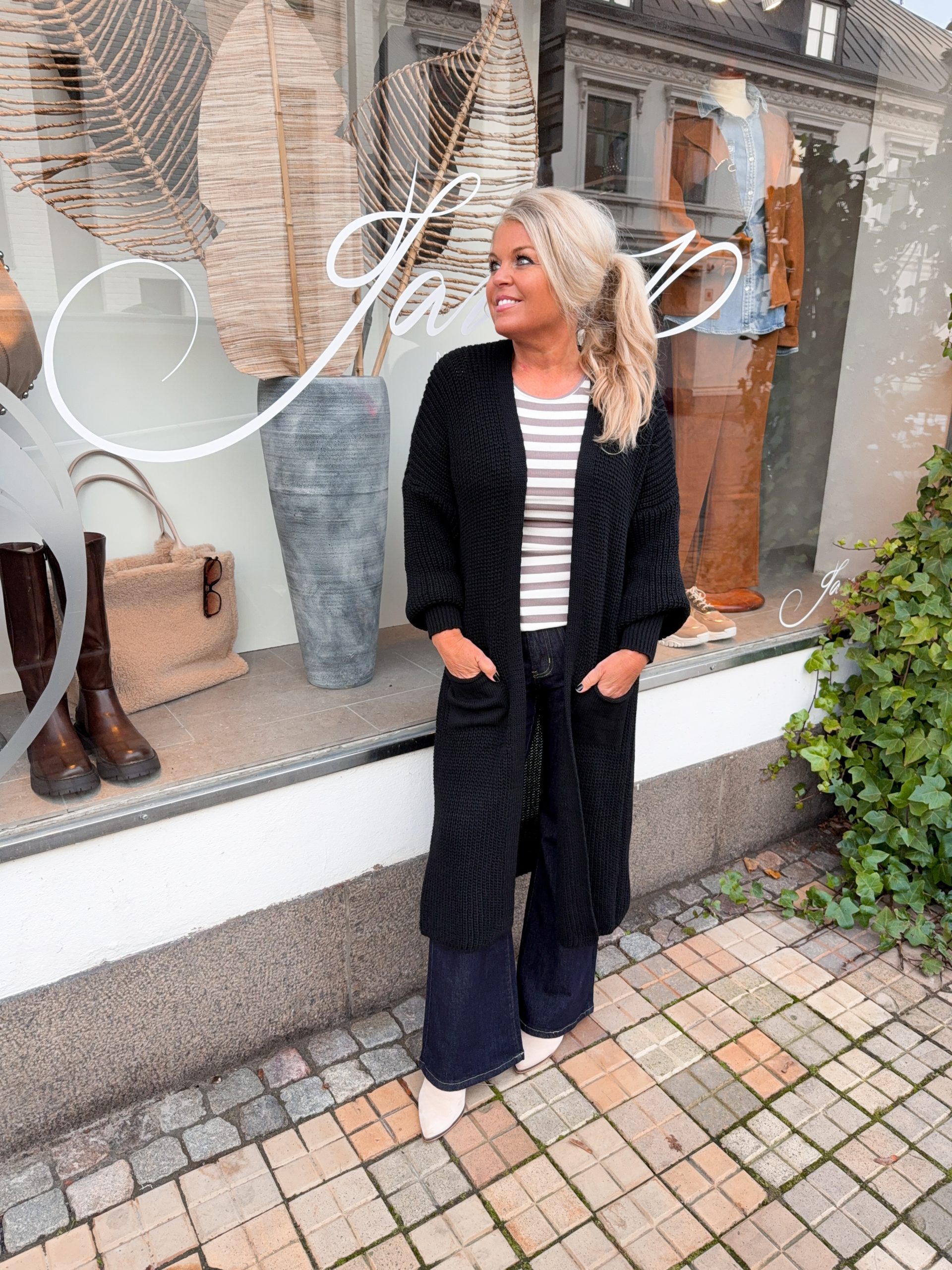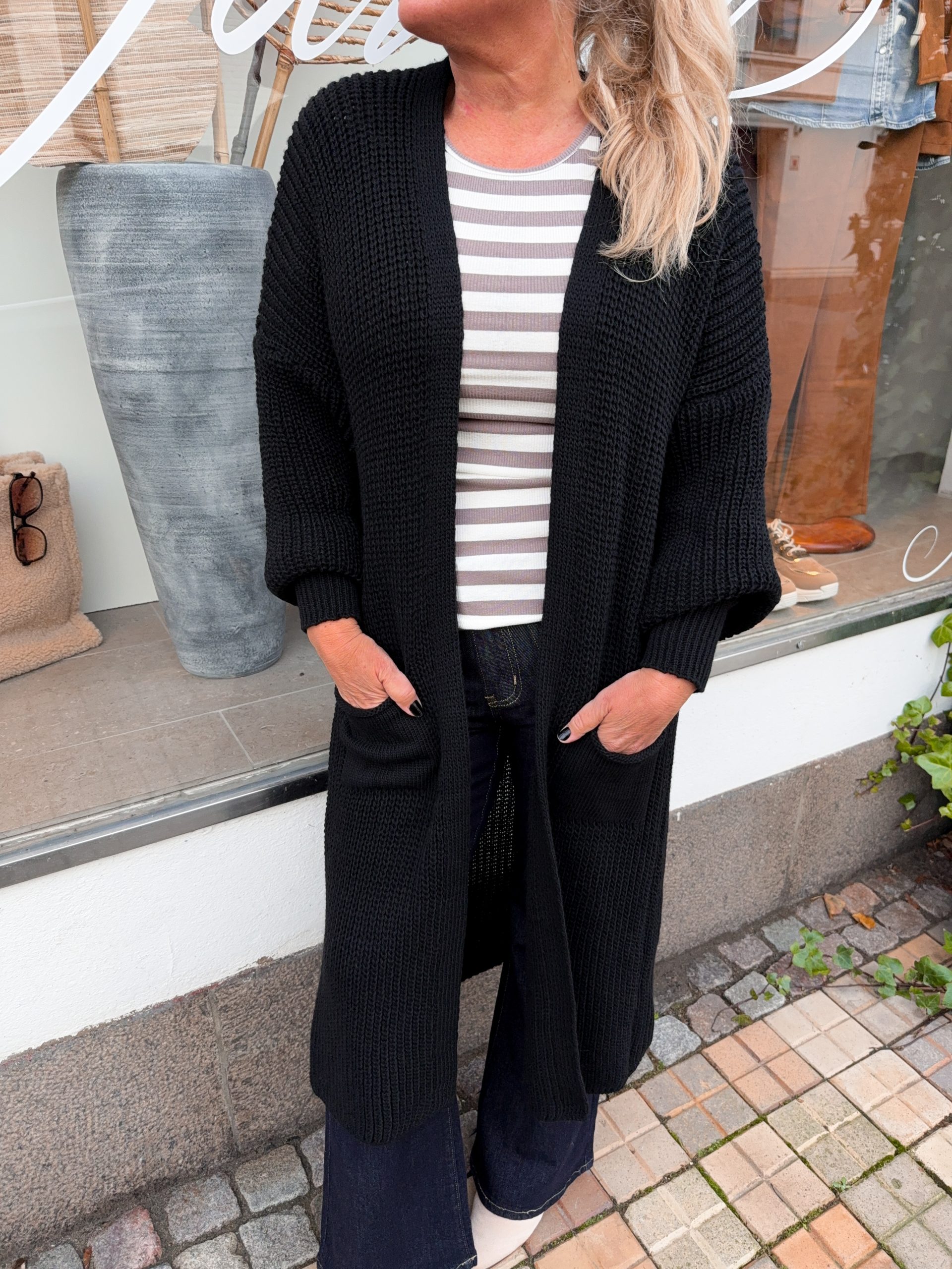 En mjuk och härlig stickad långkofta med fickor från Cosy House. Modellen är 167cm lång.