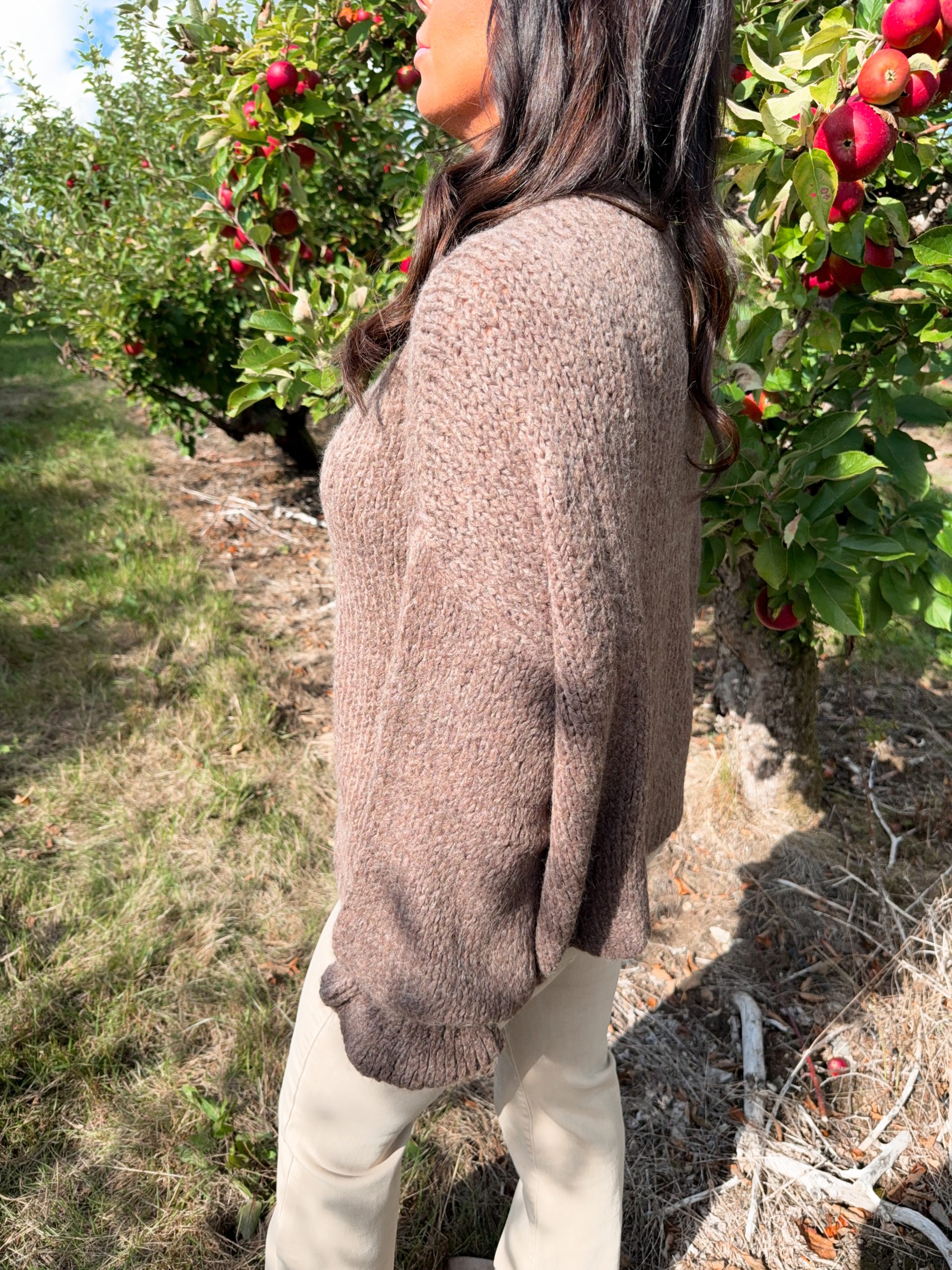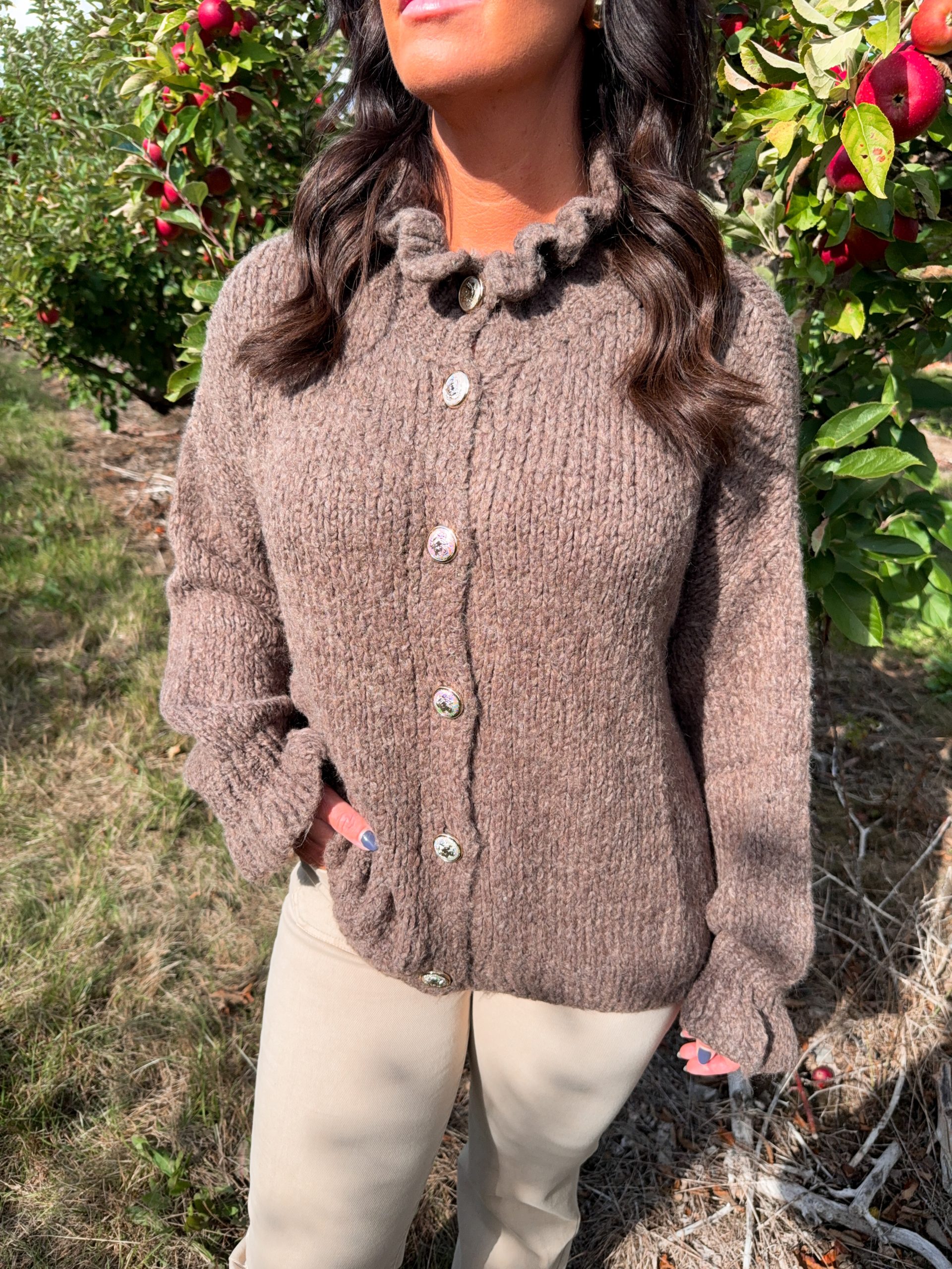 En supergosig stickad kofta med volang på krage och ärmslut. Från Gemini. Modellen är 165cm lång.