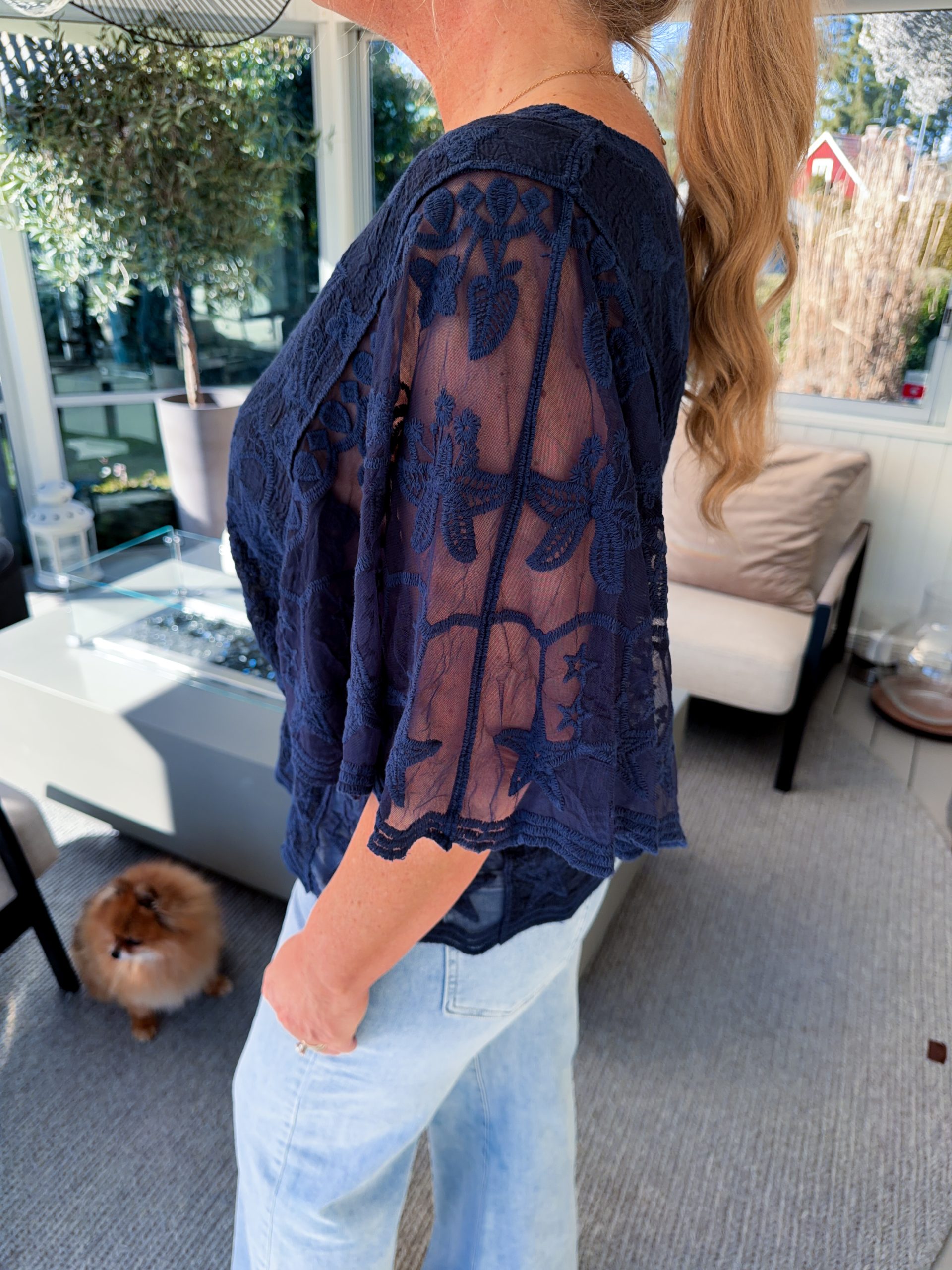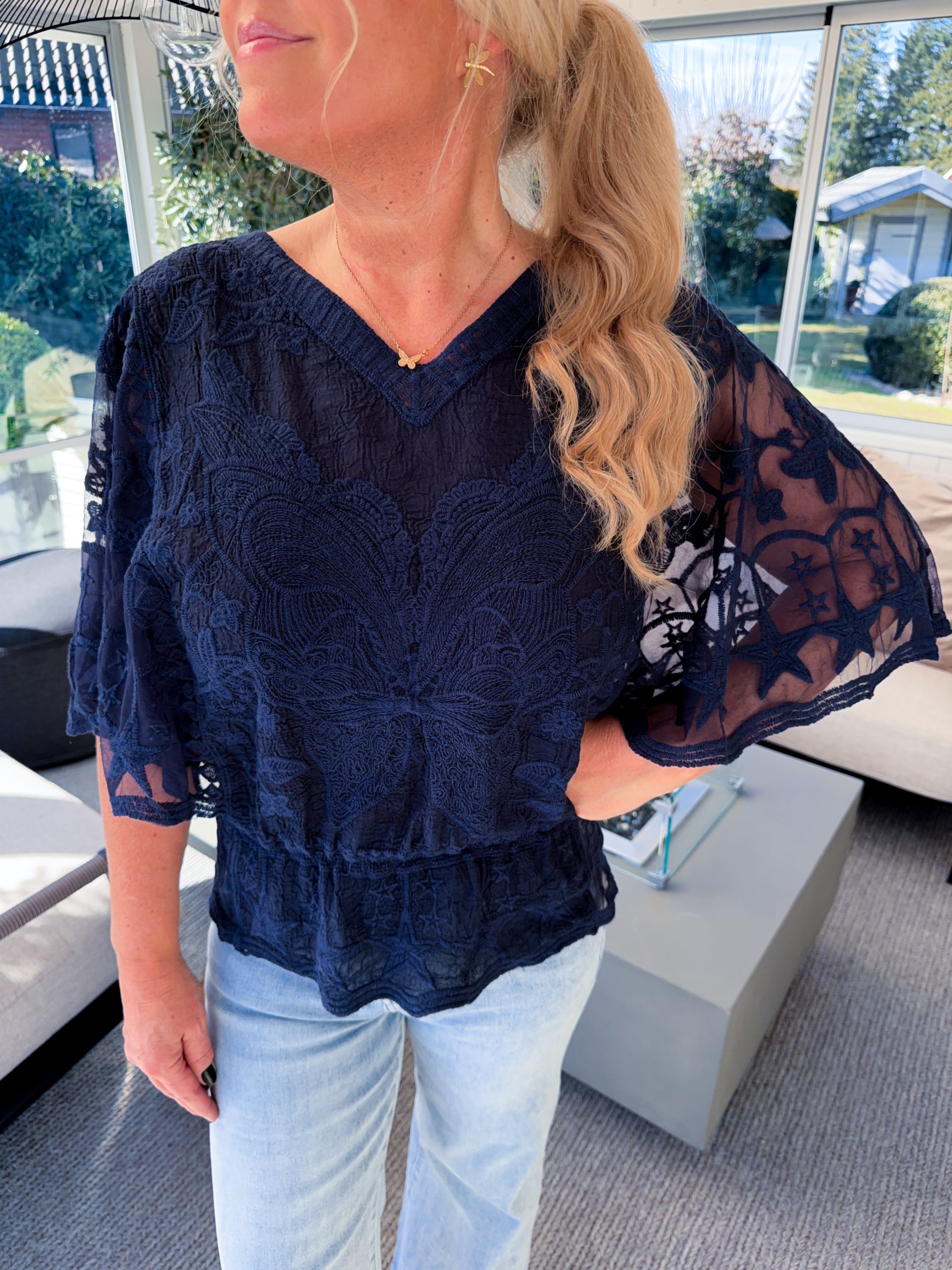 En superfin meshtopp med brodyr och vida ärmar. Resår nertill. Jana bär S/M.