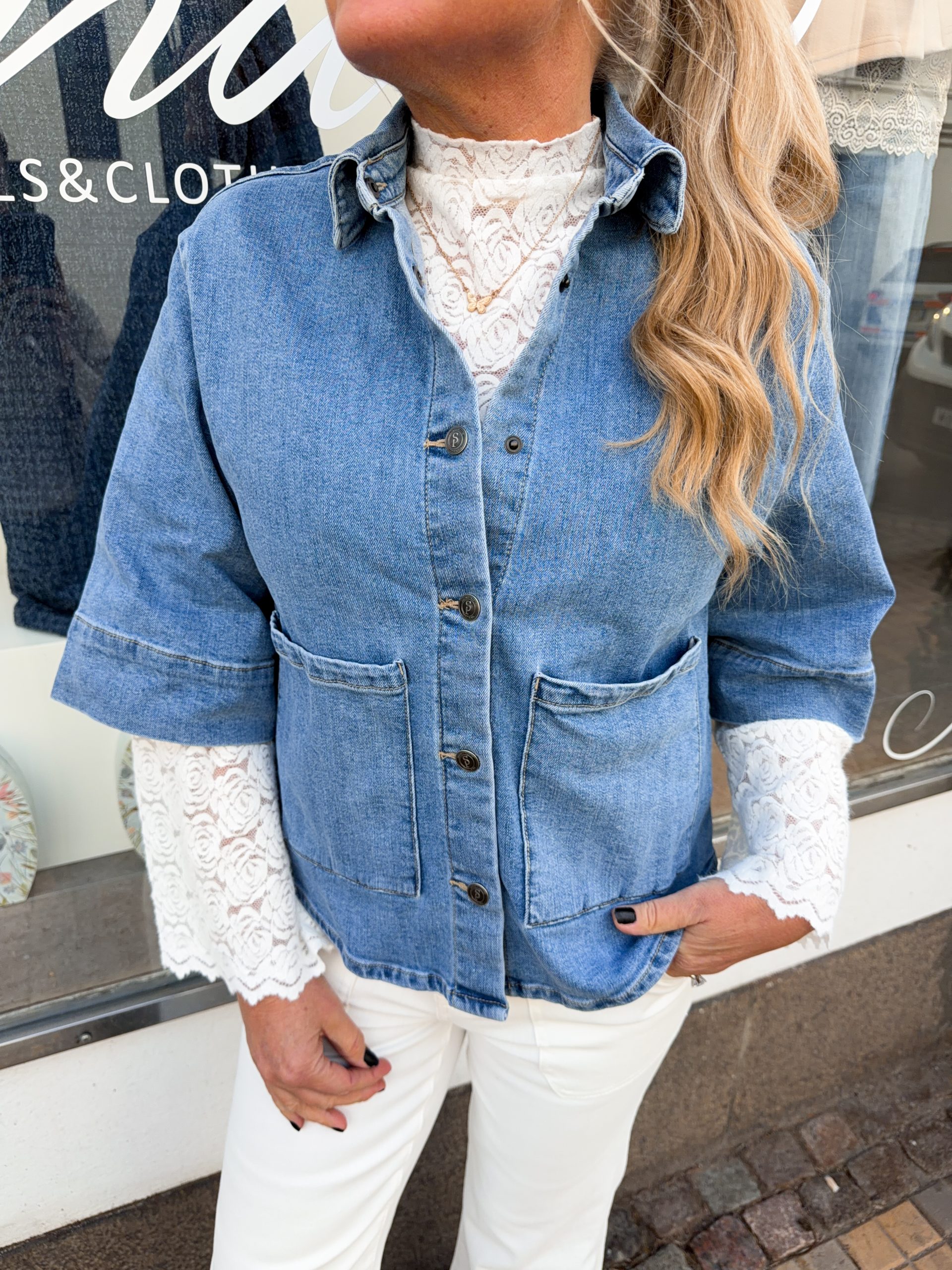 En supersnygg jeans skjort/jacka med stora fickor och breda ärmar. Lika snygg att bära öppen som stängd. Modellen är 167cm lång och bär storlek XS.