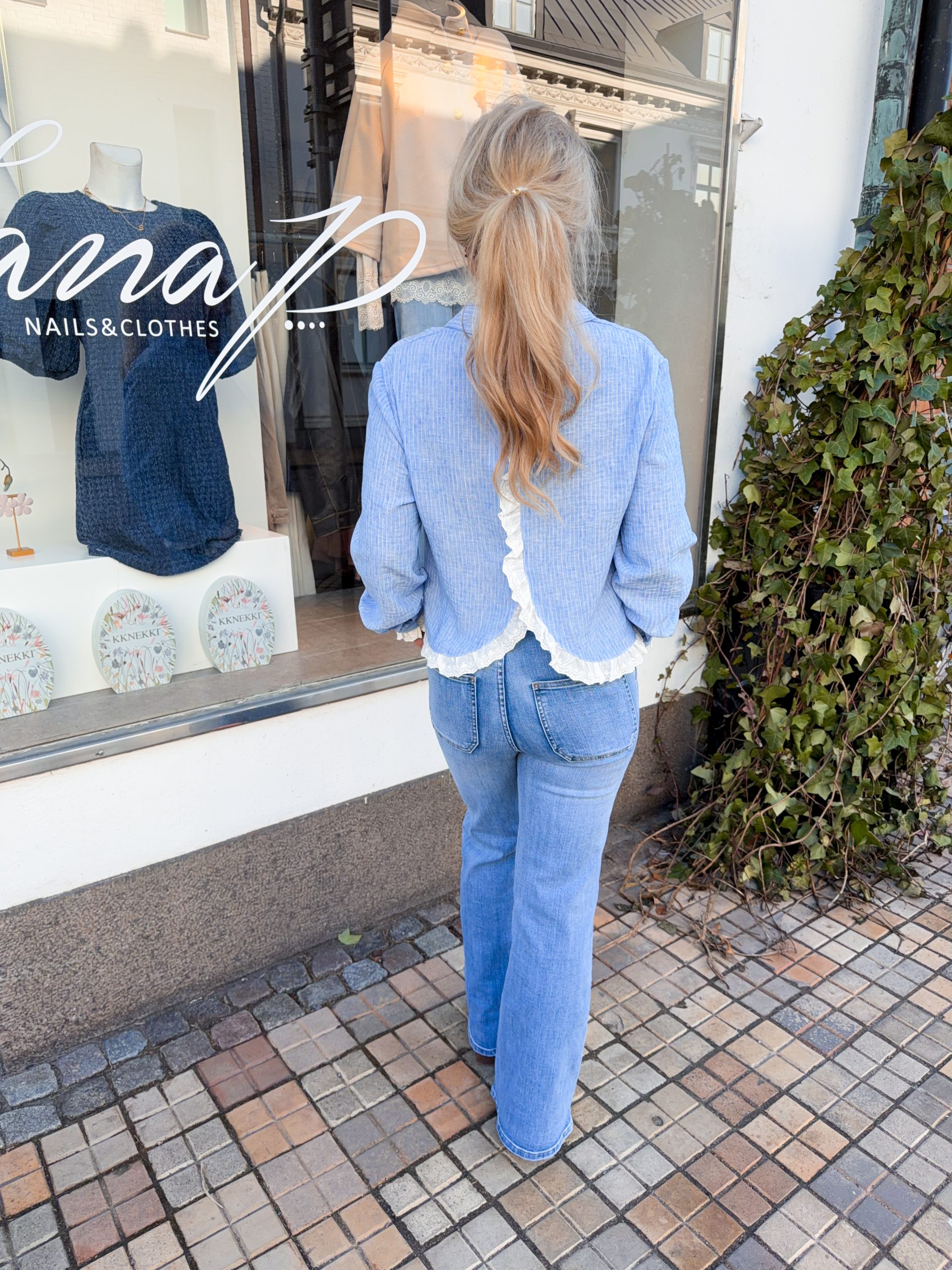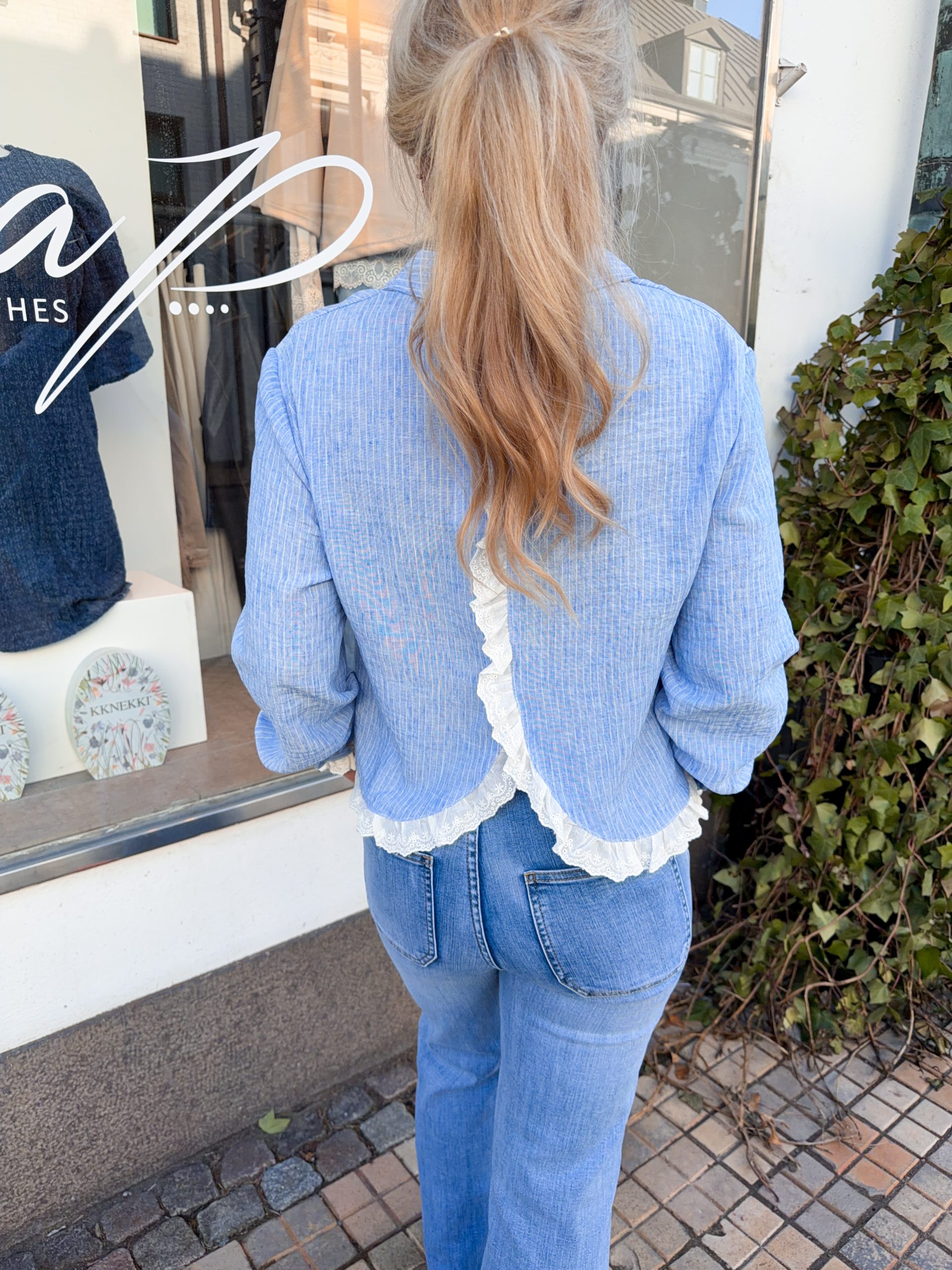 En randig skjortblus med spetskant nertill. Snygg omlottdetalj med spetskant även i ryggen. Jana bär S och är 167cm lång.