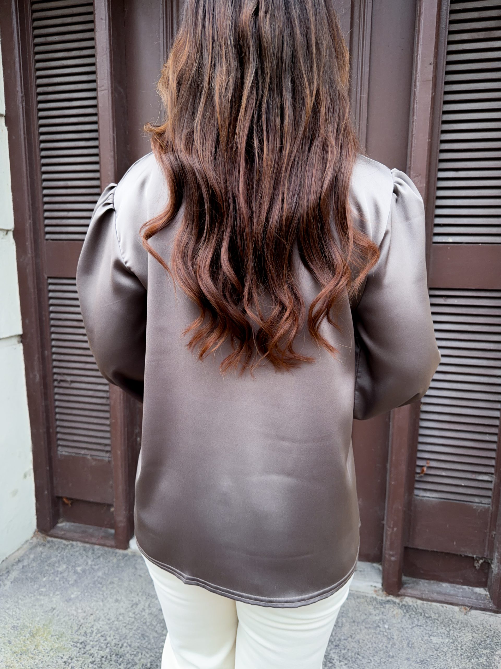 En lyxig topp med knyte runt halsen i ett satinliknande material.