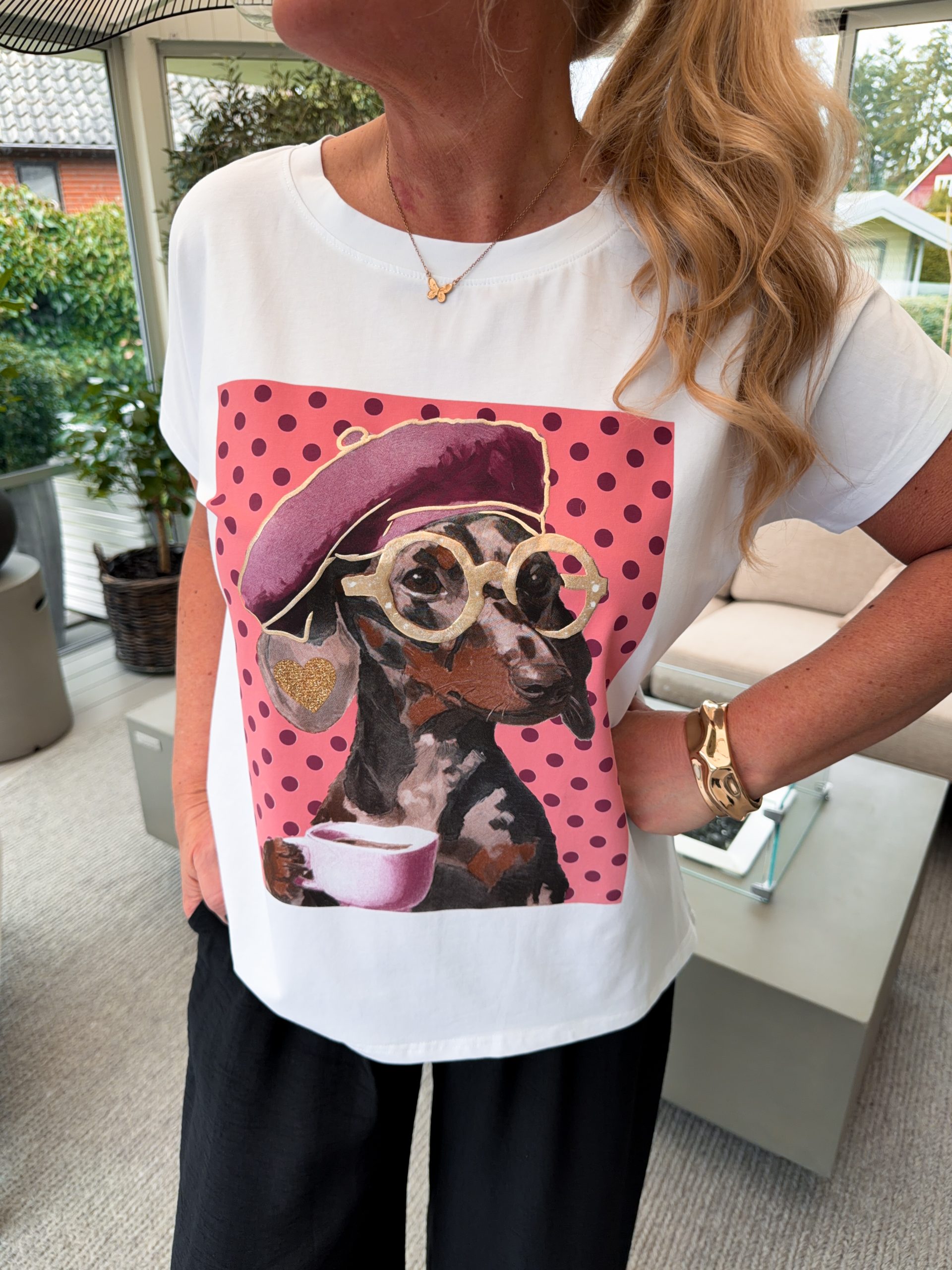 En vit T-Shirt med tryck! Jana är 167cm lång.