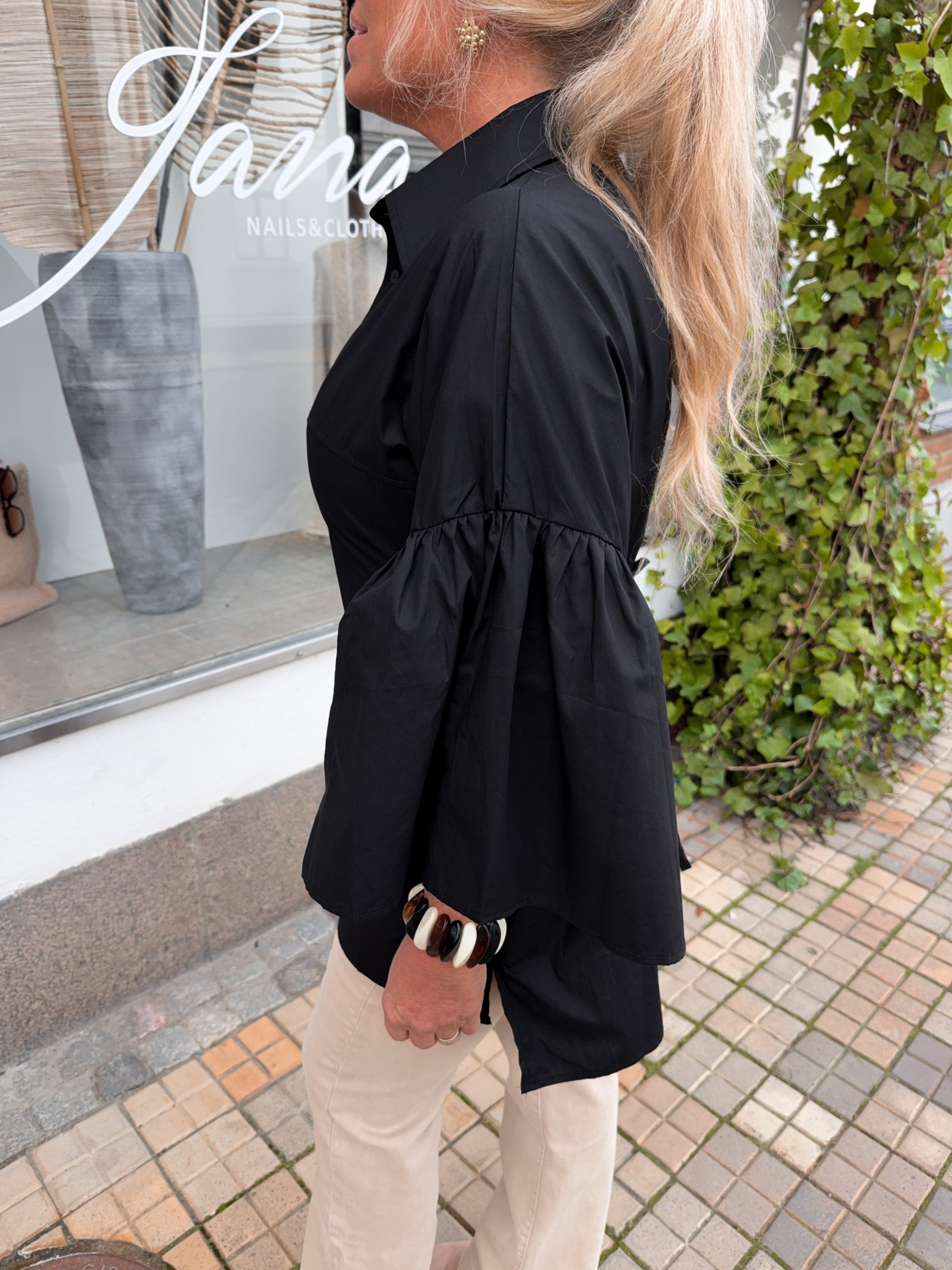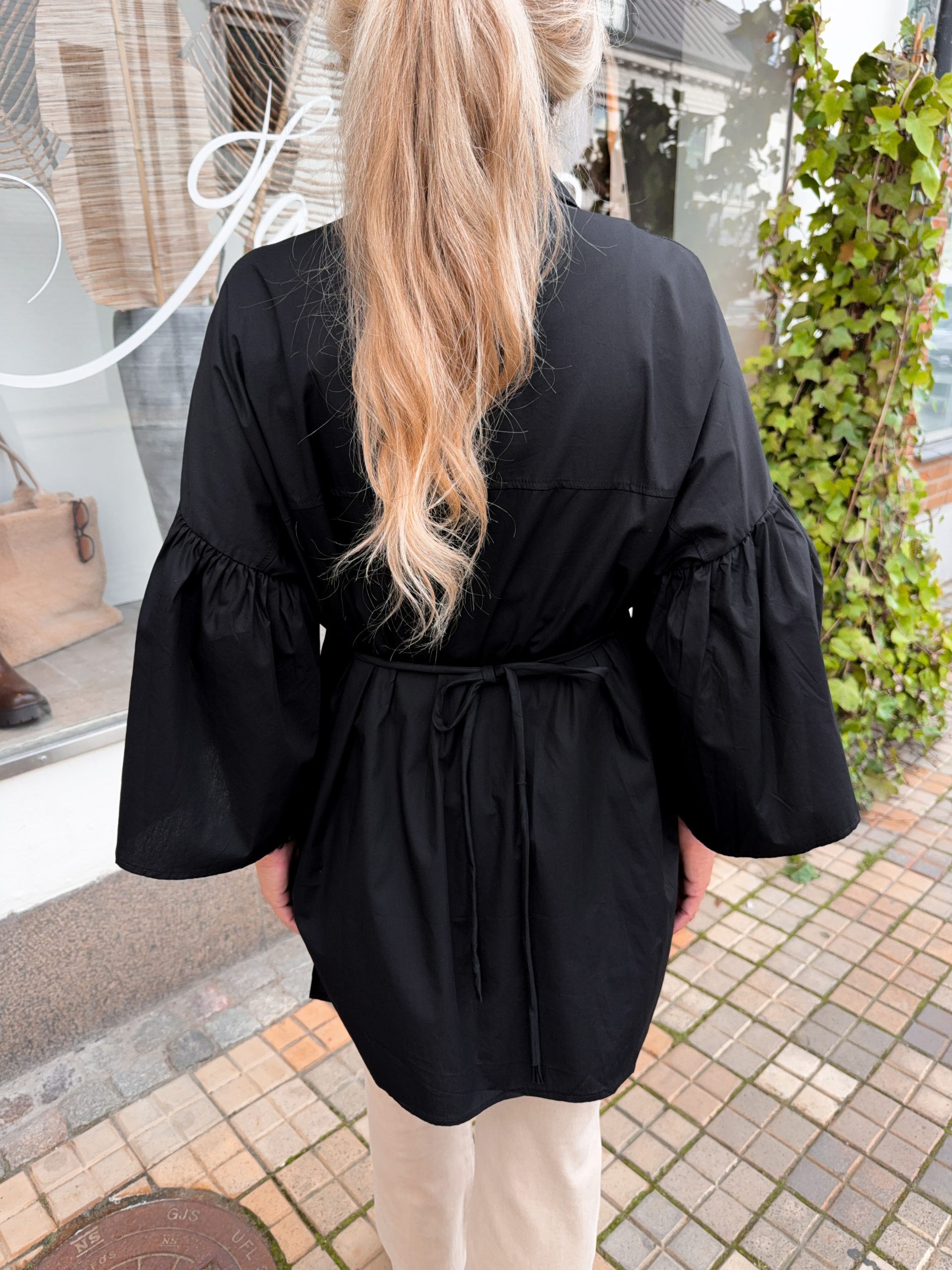 En snygg bomullsskjorta med vida trumpetärmar och knappar hela vägen. Knytband i midjan som man kan knyta antingen bak eller fram. Modellen är 167cm lång.