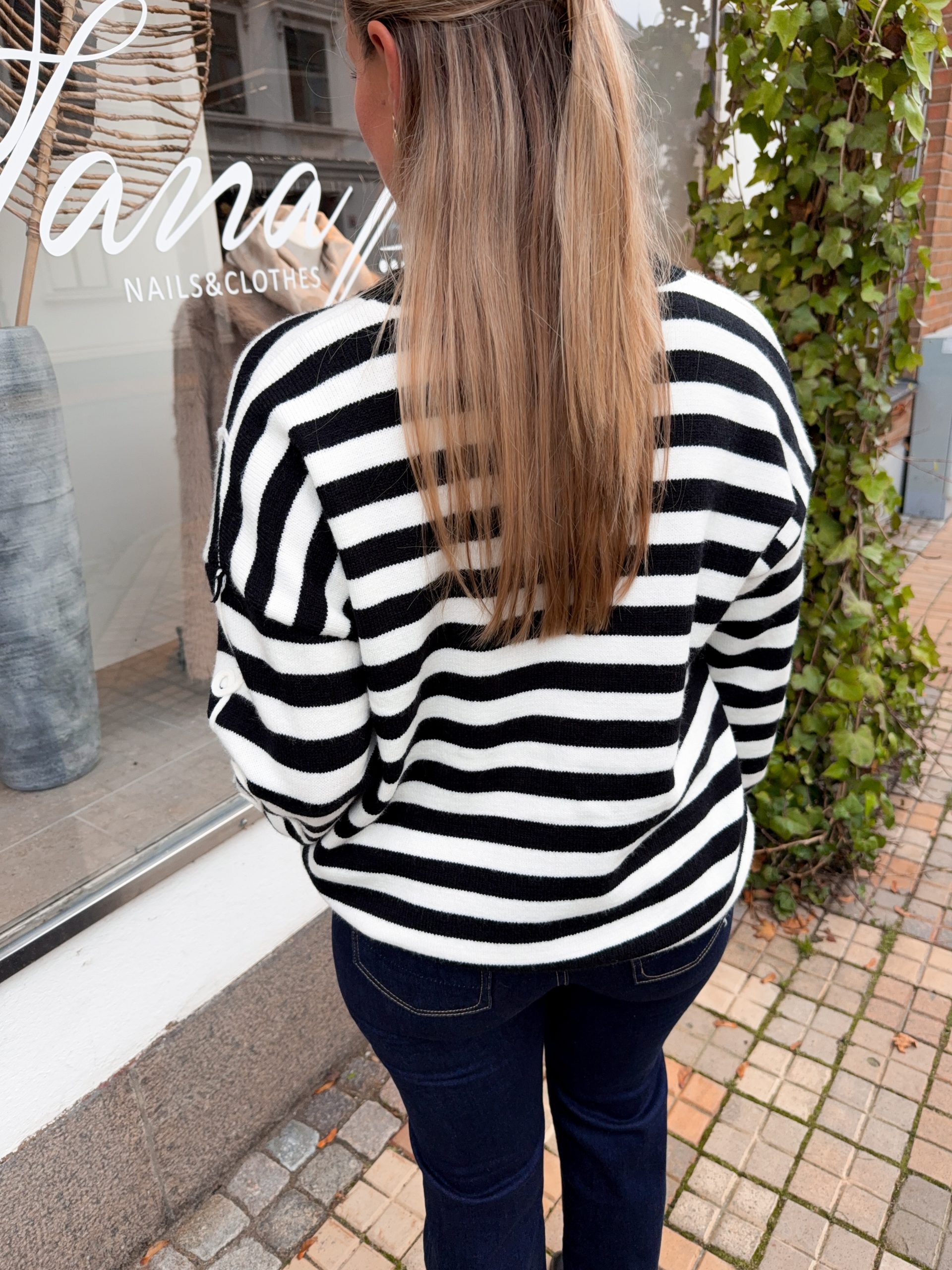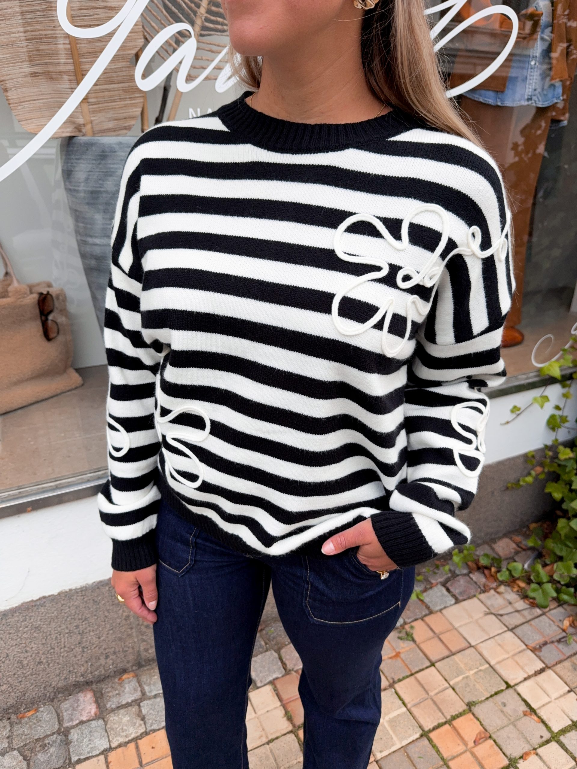 En randig stickad tröja med broderade detaljer. Modellen är 163cm lång och bär S/M.