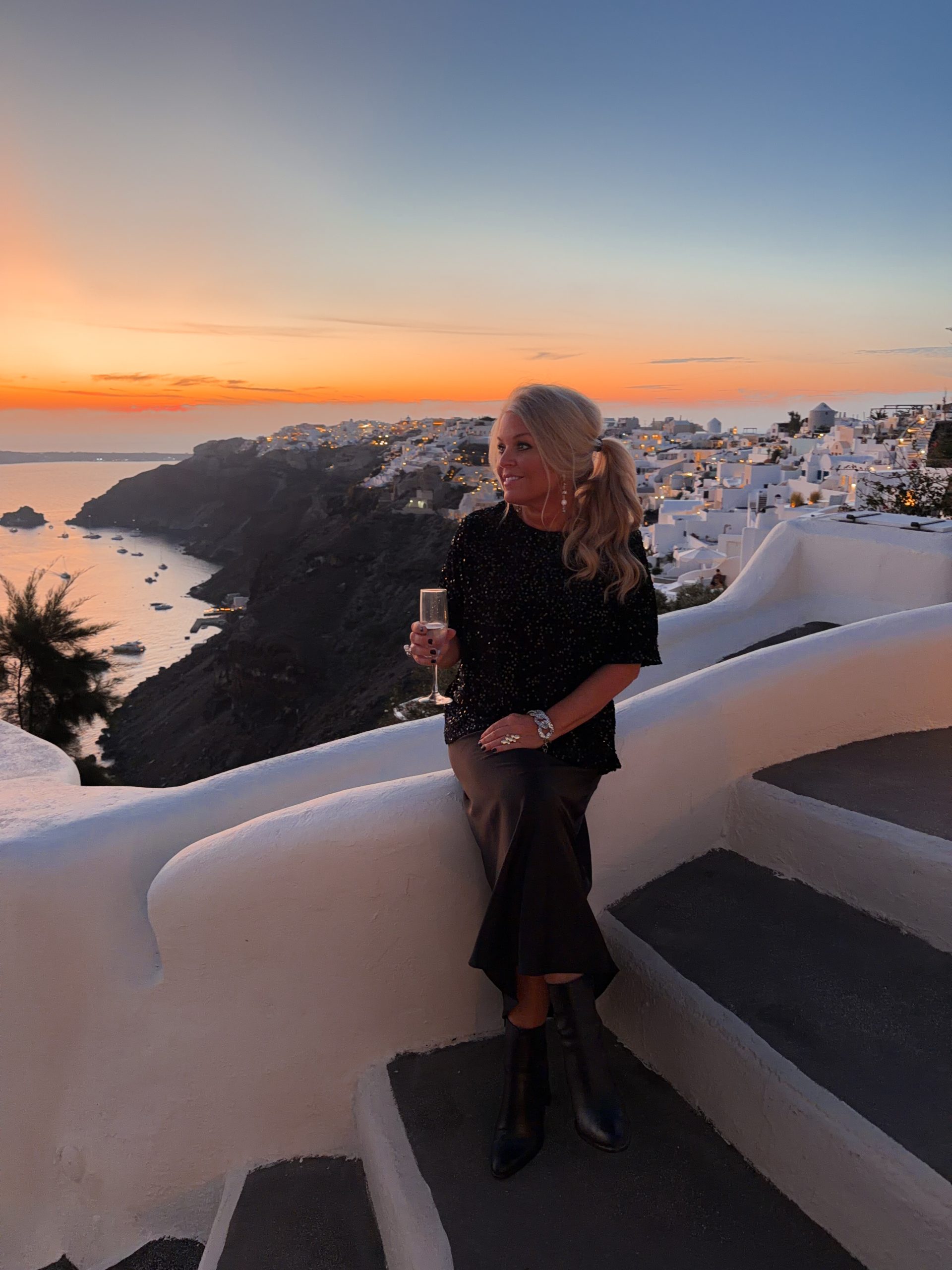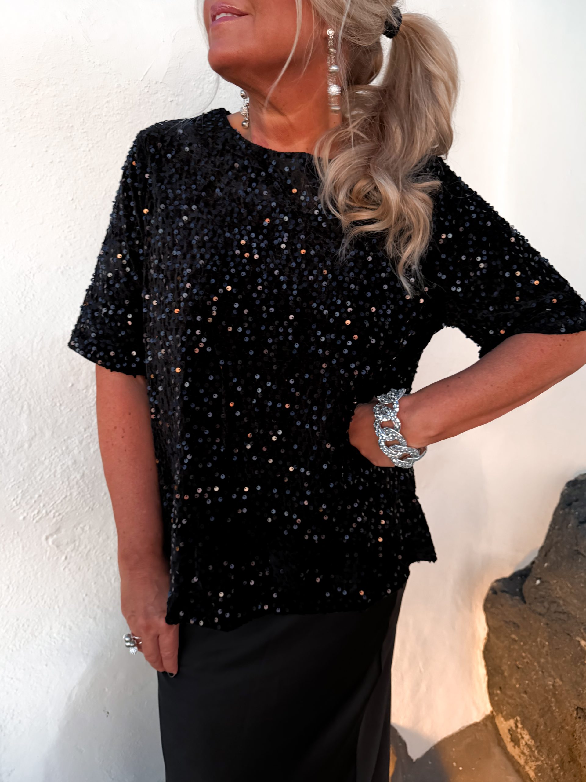 En festlig blus med paljetter. Modellen är 167cm lång och bär S/M.