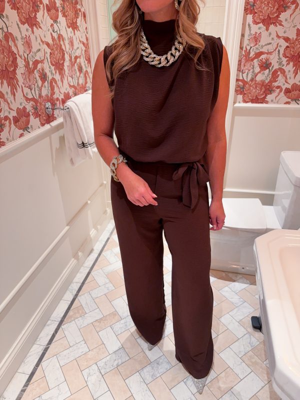En supersnygg byxdress med vida ben, knyte i midjan och lite öppen i ryggen. Modellen är 163cm lång och bär storlek S med högre klack.